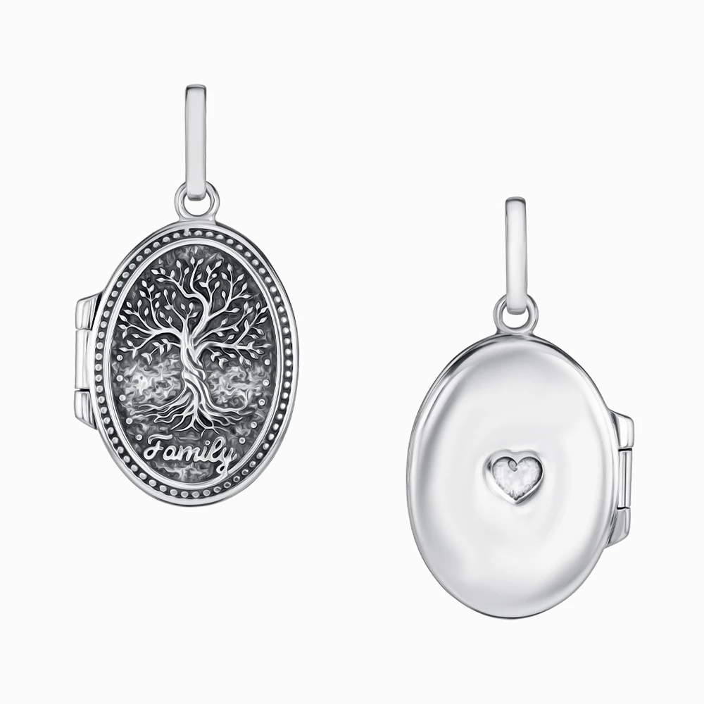 <p><strong>Размеры:</strong></p> <p>диаметр – 26*19 мм</p> <p>ушко – 9×5 мм</p> <h2><strong>Серебряная подвеска</strong></h2> <p>Элегантная подвеска из серебра 925 пробы создана в дизайне, которому присуще особое содержание. Украшение представлено в виде медальона, лицевая сторона которого украшена изображением «древа жизни» и надписью «Family», а обратная — небольшим окошком в форме сердца. Такая символика олицетворяет крепкие семейные узы, неразрывную связь поколений, благополучие. Кулон состоит из двух створок, которые можно открывать и закрывать. Это позволяет хранить внутри него маленькую фотографию или какую-то памятную вещь, напоминающую о дорогом сердцу человеке. В изготовлении ювелирного изделия использована технология чернения, которая придала серебру прочность и особый эстетический эффект. Эта модель подвески понравится тем, кто тяготеет к традиционным украшениям, уместно выглядящим в повседневном и праздничном образе.</p>