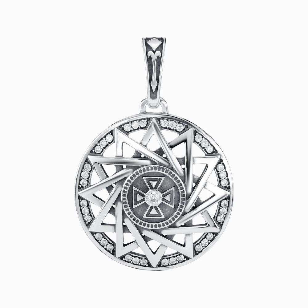 <p><strong>Размеры:</strong></p> <p>высота с ушком – 4 х 2,5 см;</p> <p>без ушка - 2,5 х 2,5 см;</p> <p>ушко – 1,2 см х 6 мм</p> <h2><strong>Серебряный подвес с куб.окс.циркония</strong></h2> <p>Этот подвес из серебра 925 пробы имеет ярко выраженный символический дизайн. В центре композиции находится стилизованный кельтский крест, окружённый геометрическим орнаментом. Есть отсылка к древнеславянской или ведической символике. Данный орнамент ассоциируется с солярными знаками — символами солнца, энергии, движения жизни.</p> <p>Пространства между лучами «звезды» инкрустированы фианитами круглой огранки, что добавляет украшению блеска и утончённости.</p> <p>Подвес выполнен с использованием технологии чернения, что подчёркивает рельеф и глубину узора. Бейл (петля для цепочки) оформлена в том же стиле и гармонично сочетается с общим дизайном.</p> <p>Украшение имеет сакральное значение и может использоваться как оберег, символизирующий свет, защиту, силу духа и гармонию.</p> <p>Носить аксессуар можно с одеждой всех стилей. Подвес идеален для повседневного использования, категория – унисекс.</p>