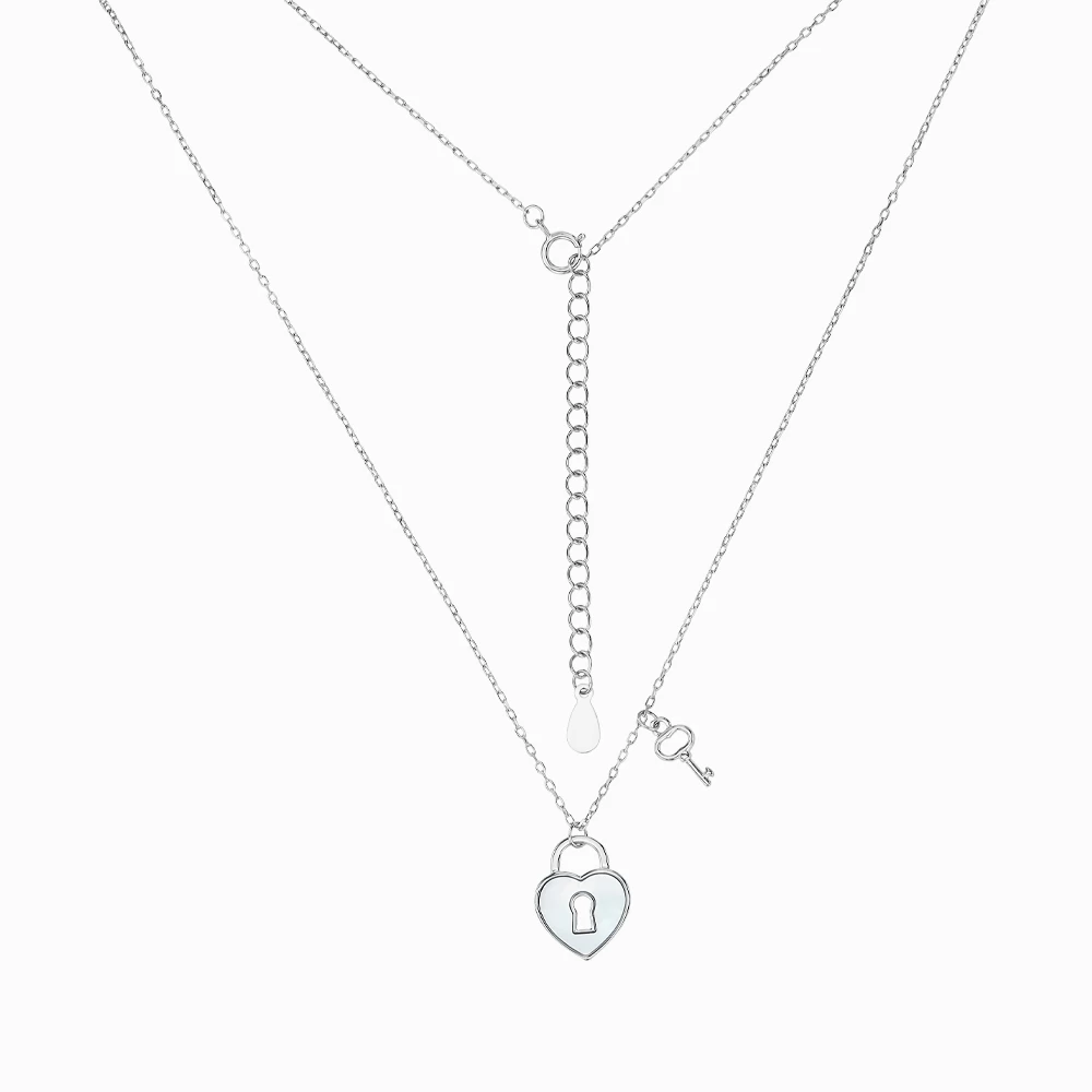 <p><strong>Размеры:</strong></p> <p>декоративная часть – 10 мм × 5 мм, 15 мм × 10 мм</p> <h2><strong>Серебряное колье с перламутром</strong></h2> <p>Романтичное колье изготовлено из серебра 925 пробы, обработанного родием. Благодаря этому драгоценность поражает фантастическим блеском, который она будет сохранять в течение долгих лет без риска окислиться или каким-либо другим образом потерять свою первоначальную эстетику. Цепь классического якорного плетения украшает вставка в виде замочка сердцевидной формы. Он покрыт перламутром, создающим нежные радужные переливы. Рядом находится изящный ключ. Эту символику можно трактовать как олицетворение вечной любви, доверия и верности. Такой аксессуар подойдет и той, к сердцу которой уже нашли «ключик», и той, кто еще ожидает свою искреннюю любовь. Колье оснащено шпрингельным замком и регулируется по длине. Подходит к разнообразным повседневным образам, но при удобном случае сможет превратиться в утонченное праздничное украшение.</p>