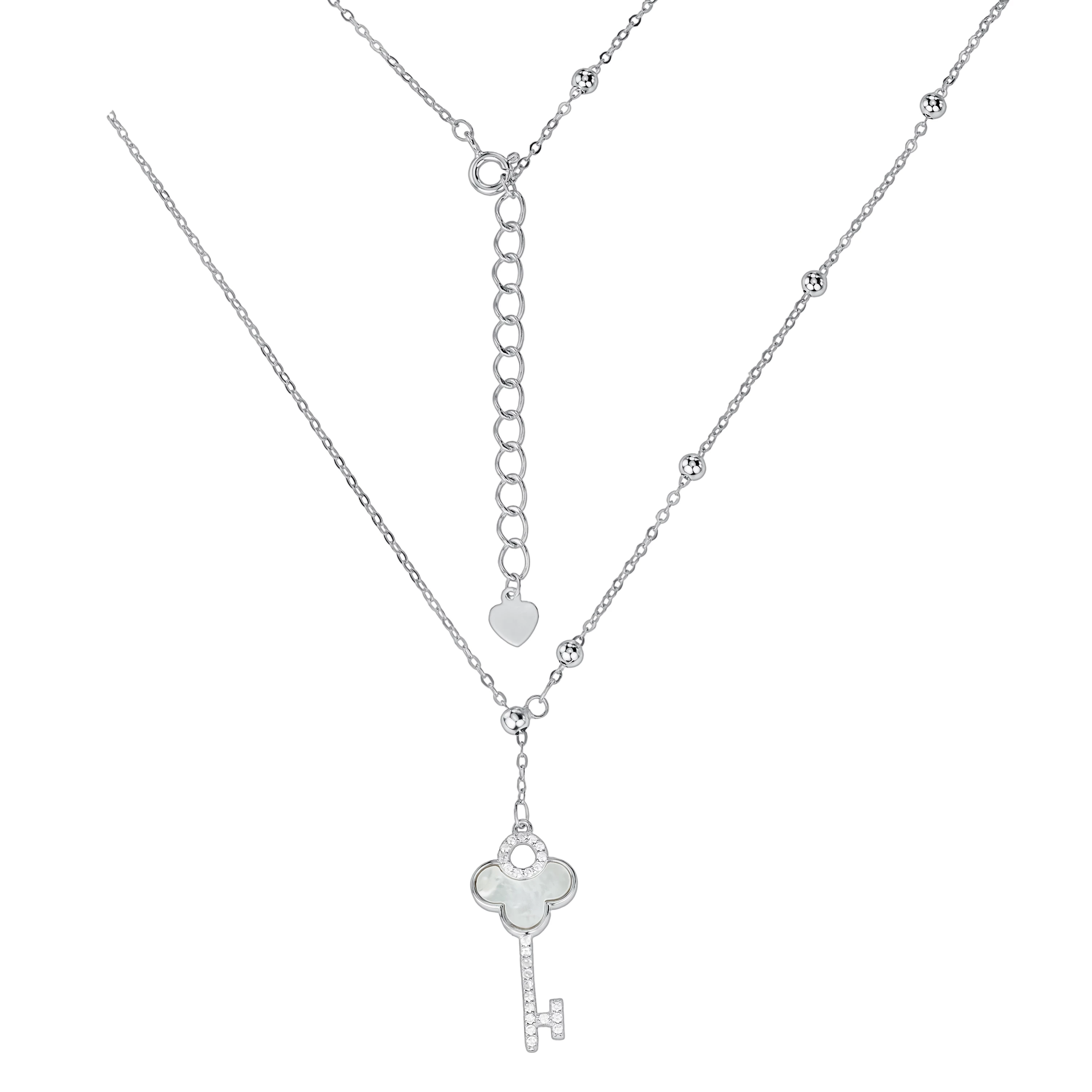 <p><strong>Размер:</strong></p> <p>ширина цепочки — 2 мм</p> <p>размер подвески — 10 х 25 мм</p> <h2><strong>Серебряное колье с перламутром и фианитами</strong></h2> <p>Элегантное колье с оригинальной подвеской в форме ключа, изготовленное из серебра 925 пробы. Центральным элементом украшения является изящная подвеска-ключик, украшенная изысканным перламутром и яркими фианитами, создающими великолепное мерцание. Якорная цепочка дополнительно украшена несколькими фианитами, привлекающими внимание своим блеском. Родиевое покрытие защищает украшение от потемнения на протяжении многих лет использования. Изделие оснащено надежной шпрингельной застежкой и дополнительными звеньями для регулировки размера. Это колье отлично подходит как для повседневной носки, так и для особых торжественных случаев.</p>