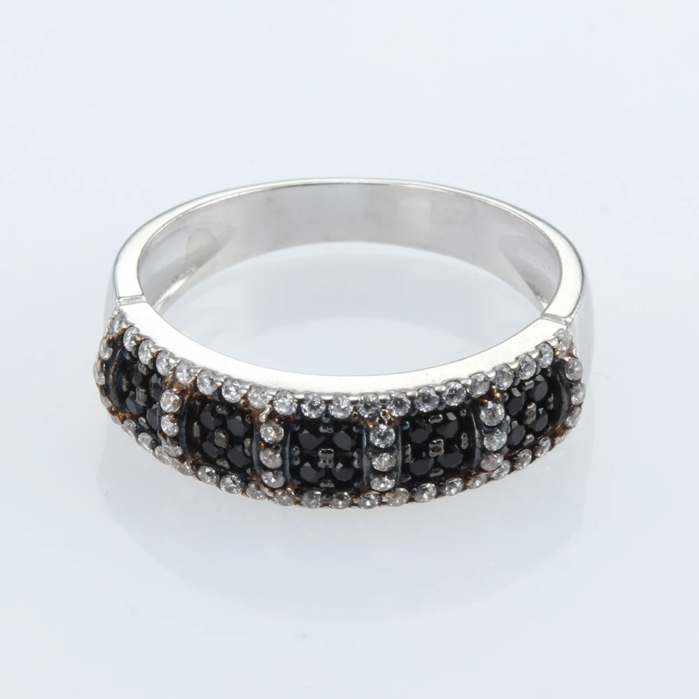 <p><strong>Размеры:</strong></p> <p>ширина шинки – 5 мм</p> <h2><strong>Серебряное кольцо с фианитами</strong></h2> <p>Главным признаком этой модели кольца, изготовленного из серебра 925 пробы, является удачное сочетание лаконичной формы и лучистого сияния блестящих минералов. Декоративная часть ювелирного изделия представлена вставкой из комбинации черных и белых фианитов. Они установлены с помощью закрепки Паве и выложены таким образом, что демонстрируют незатейливый орнамент. Чтобы обеспечить украшению надежную защиту от потемнения и появления на поверхности повреждений, драгоценность покрыли слоем родия. Благодаря отсутствию в дизайне кольца элементов сложной формы, серебряный аксессуар будет достаточно легко сочетать с другими украшениями. Это позволит использовать его в повседневном и торжественном образе, надевая под наряды разных стилей.</p>