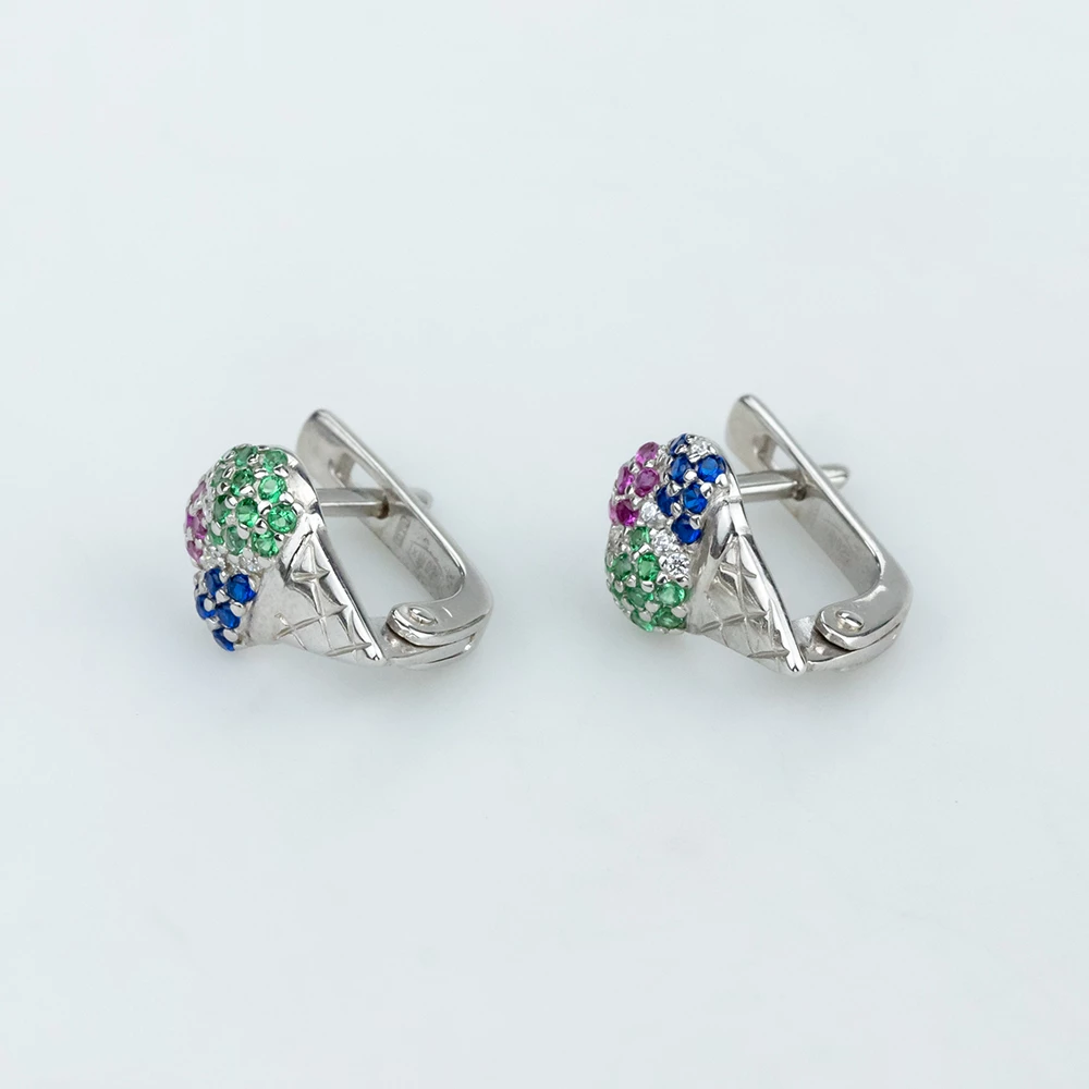 <p><strong>Размер:</strong></p> <p>длина - 12 мм</p> <p>ширина - 8 мм</p> <h2><strong>Серебряные серьги с кубическим оксидом циркония</strong></h2> <p>Серебряные серьги 925 пробы выполнены в необычайно изысканном дизайне. Эта модель украшена фианитами безупречной круглой огранки синего, зеленого и фиолетового цвета. Камни размещены в виде очаровательных цветочков и надежно закреплены корнерами. Благородный белый цвет и сияющий блеск серебро обладает благодаря покрытию благородным родием. Тип застежки — английская.</p> <p>Элегантные серьги украсят любой наряд: как будничный, так и праздничный. Деликатный вес идеально подойдет даже для детских ушек. Рекомендуем подобрать на сайте кольцо и подвеску соответствующего стиля для полного комплекта.</p>