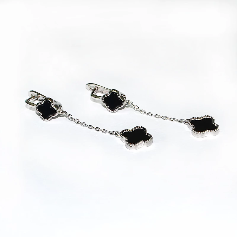 <p><strong>Размер:</strong></p> <p>штифт – 7 мм</p> <p>длина – 43 мм</p> <p>ширина – 9 мм</p> <h2><strong>Серебряные серьги-подвески с ониксом</strong></h2> <p>Элегантные серьги-подвески из серебра 925 пробы с ониксом помогут создать яркий и контрастный образ. Дизайну присуща изысканная строгость, которая придаст их владелице загадочности.</p> <p>Основной декоративный элемент аксессуара – четырехлистный клевер. Один из них украшает фиксированную часть драгоценности, а другой является подвижным, так как изящно свисает с цепи якорного плетения. Каждый лист имеет вставку из черного оникса, окруженную зернистым обрамлением. В комбинации с ослепительным сиянием родированного серебра, защищенного от окисления, серьги выглядят эффектно. К тому же в их выполнении прослеживается символический смысл. Четырехлистный клевер воплощает удачу, надежду, веру и любовь, в то время как оникс глубокого черного цвета является олицетворением стабильности, внутренней уверенности, защиты от негативной энергии. Украшение удобно фиксируется в мочке уха с помощью английской застежки.</p> <p>Серьги идеально дополнят деловой, повседневный или вечерний образ, добавив к нему шика. Храните их в отдельном мешочке или футляре, чтобы предотвратить появление царапин на камне.</p>