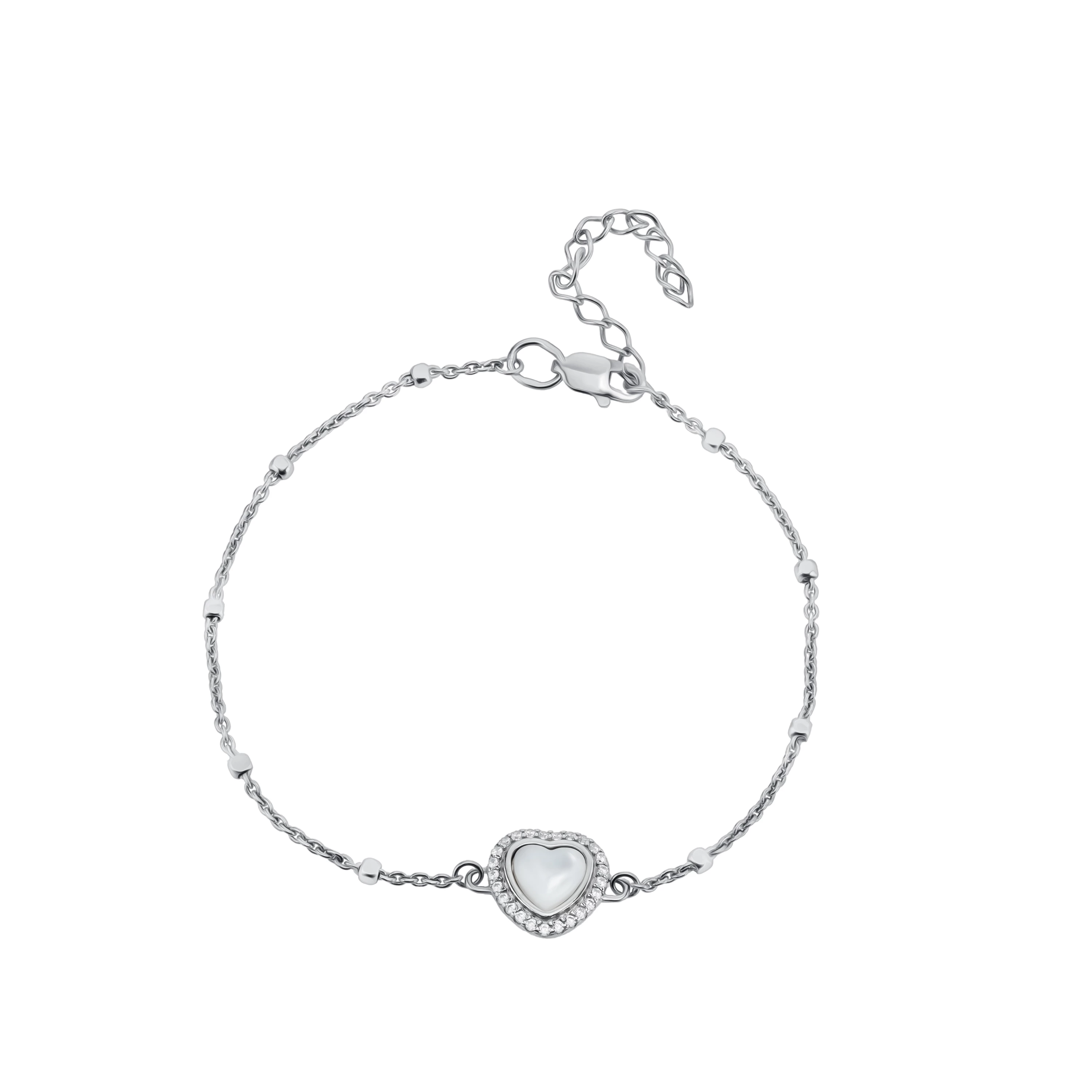 <p><strong>Размеры:</strong></p> <p>Ширина плетения 1мм</p> <p>Размер декоративной части 10мм/10мм</p> <h2><strong>Серебряный браслет с перламутром плетение якорное </strong></h2> <p>Элегантная модель браслета выполнена в серебре 925 пробы. Основу браслета составляет якорное плетение, оно считается одним из самых крепких и практичных. На плетении есть декоративные вставки в виде лаконичных шариков, а в центре внимания вставка сделана в виде сердца. Центральная вставка представлена в виде перламутра, дополнительно инкрустированного сияющим куб.окс.циркония. Фианиты закреплены корнеровой закрепкой, она надежно фиксирует вставки. Благодаря технологии родирования изделие имеет красивый металлический оттенок и блеск. Застежка – карабин, данный тип застежки является практичным и надежным, а за счет небольших размеров гармонично вписывается в общий дизайн украшения. Особенностью браслета является наличие дополнительных звеньев, позволяющих регулировать размер под ваше запястье. Браслетом можно стилизовать любой ваш образ, как повседневный, так и деловой.</p>
