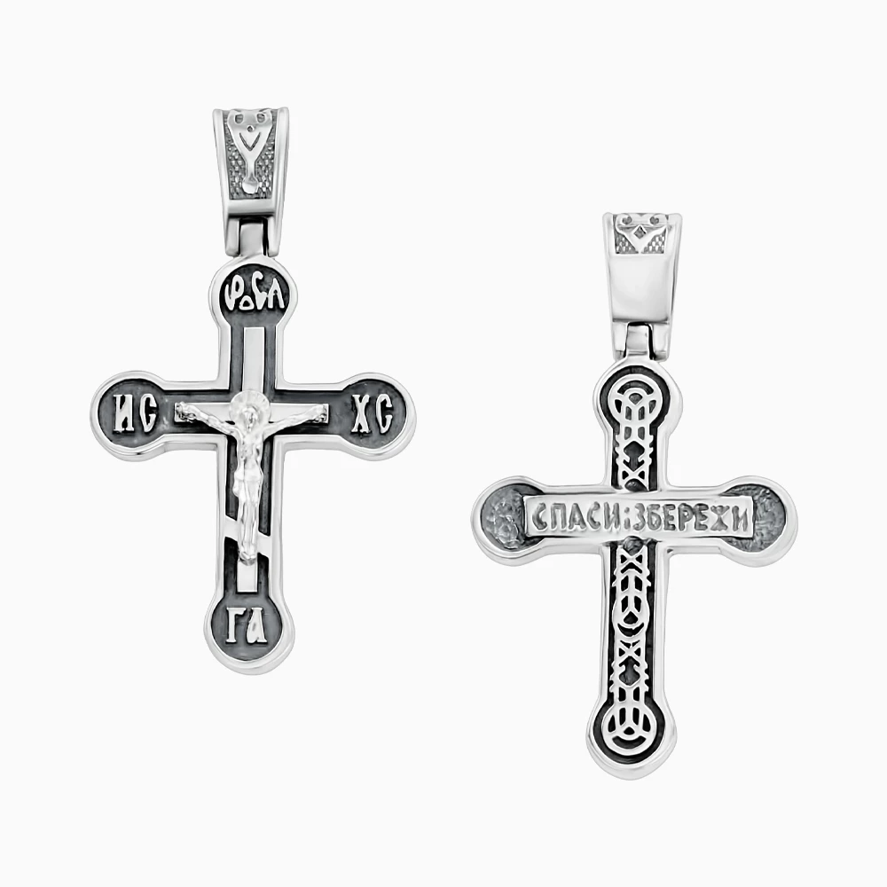 <p><strong>Размеры:</strong></p> <p>Диаметр: 2,5 см</p> <p>Ширина: 2 см</p> <p>Ушко: 7 мм</p> <h2><strong>Серебряный крестик</strong></h2> <p>Этот крестик изготовлен из серебра 925 пробы и украшен чернением, которое придаёт рельефным деталям особую выразительность и глубину. На лицевой стороне изображено распятие Иисуса Христа — центральный символ христианской веры. По бокам креста гравировка: «ИС» и «ХС» — церковнославянские сокращения имени Иисуса Христа. На обратной стороне крестика размещена надпись: «Спаси і збережи» — традиционное прошение о защите, которое поколениями носили у сердца как оберег. Эта надпись придаёт украшению ещё больше духовного смысла. Благодаря универсальному дизайну и сдержанному оформлению, крестик подходит как для повседневного ношения, так и в качестве особого подарка с глубоким значением.</p>
