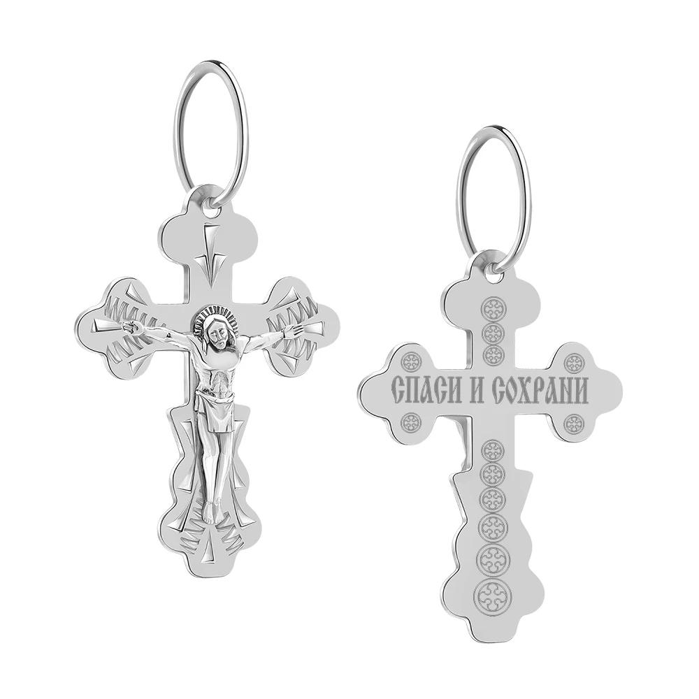 <p><strong>Размер:</strong></p> <p>ширина - 1,6 см</p> <p>длина с ушком - 2,9 см</p> <p>длина без ушка - 2,3 см</p> <h2><strong>Серебряный крестик.</strong></h2> <p>Крестик выполнен из серебра 925 пробы и имеет родиевое покрытие, которое обеспечивает длительный блеск металла, защищает его от царапин и повышает износостойкость. Передняя часть изделия украшена в технике алмазной грани. В центральной части крестика расположено Распятие Христово. На обратной стороне изделия в лазерной технике нанесена надпись “Спаси и Сохрани” и узоры на религиозную тематику. Достаточно широкое ушко позволяет носить крестик как с декоративными шнурками, так и с цепочками различных плетений. Изделие выполнено согласно православных традиций, поэтому идеально подойдет для верующих людей, для крестин, а также станет оберегом и талисманом. Универсальный дизайн позволит легко вписать крестик в Ваш повседневный гардероб и комбинировать с другими Вашими украшениями.</p>
