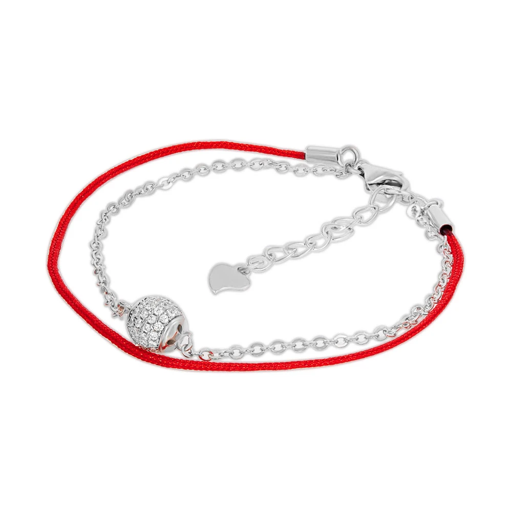 Браслет выполнен из серебра 925 пробы. Браслет состоит из цепочки якорного плетения, которая украшена подвесом с куб. окс. циркония и красной текстильной нити. Браслет на шпрингельной застежки и с длиной цепочкой при помощи, которой регулируется размер.