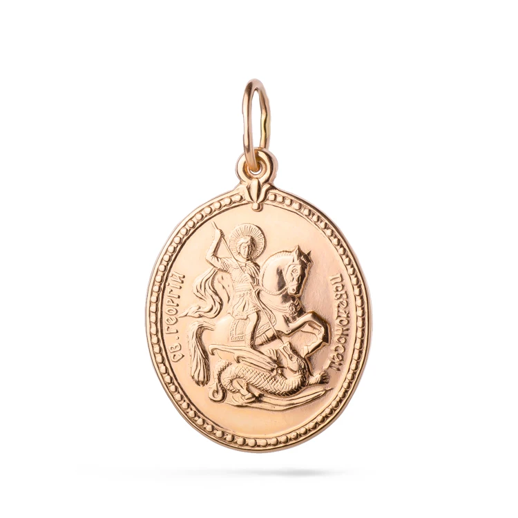 Золотая ладанка Георгий Победонец. Образ Великомученика олицетворяет собой заступника для верующих, чья жизнь имеет какое-либо отношение к военным делам, но также он может оберегать и землевладельцев. Размеры изделия, мм: ширина - 20; высота - 23