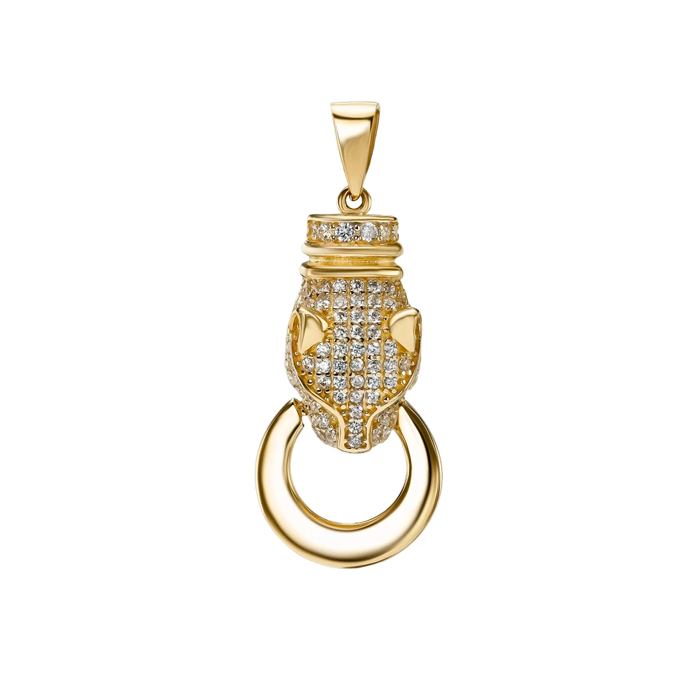 <p><strong>Размеры:</strong></p> <p>длина – 25 мм</p> <p>длина с ушком – 35 мм</p> <p>ширина – 10 мм</p> <p>ушко – 8×4 мм</p> <h2><strong>Золотая подвеска с фианитами</strong></h2> <p>Стильная подвеска создана из желтого золота 585 пробы, которое восхищает своим роскошным оттенком. Ювелирное произведение представлено в виде покрытой прозрачными фианитами головы пантеры с кольцом в пасти. Глаза дикой кошки украшены кубическим цирконием зеленого цвета, от которых исходит будто бы магическое сияние. Неспроста именно пантеру выбрали символом известного модного дома Cartier, ведь она олицетворяет неукротимость, изящество, грацию, темпераментность и свободу. Украшение стоит того, чтобы стать деталью вечернего образа, который должен вызвать вау-эффект. В объемное ушко легко протянуть цепочку даже немалой ширины, так что подвеску можно носить на драгоценном аксессуаре любого типа плетения.</p>