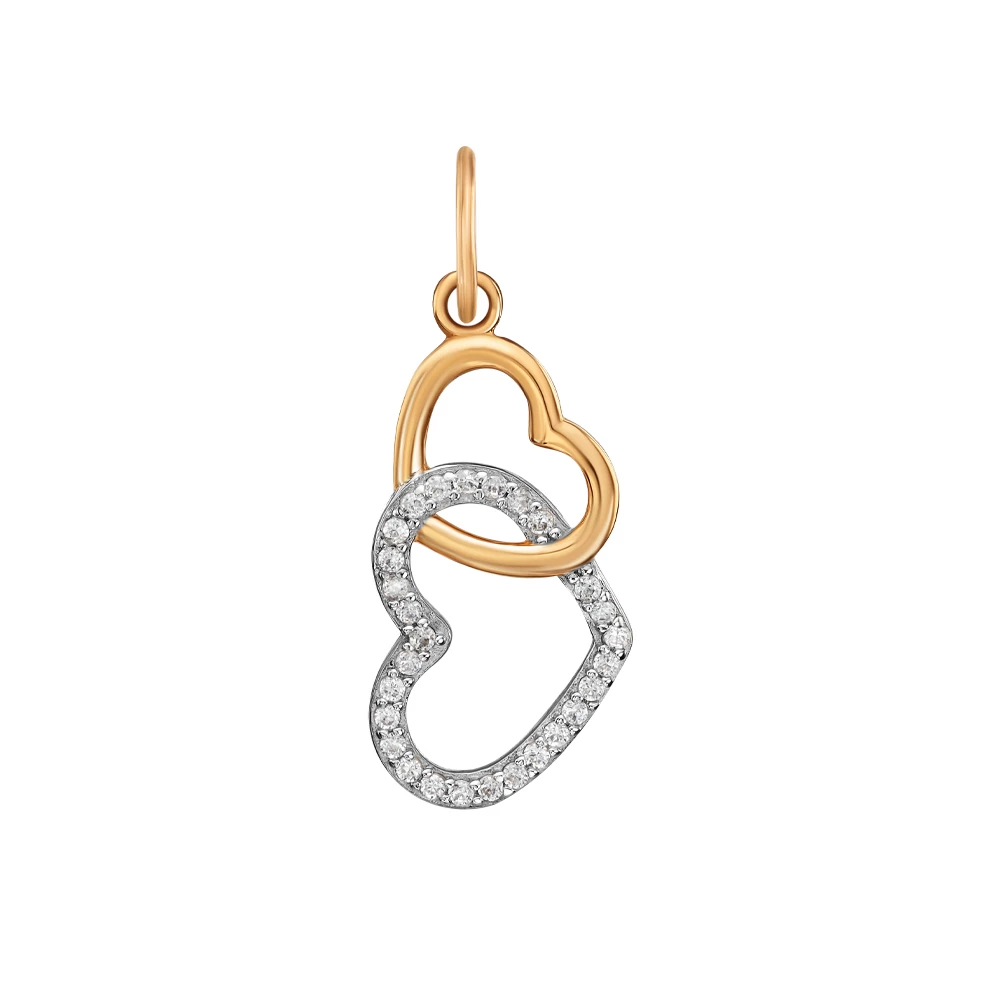 <p><strong>Размер:</strong></p> <p>Ширина – 10 мм</p> <p>Длина с ушком - 26 мм</p> <p>Ушко – 4 мм х 7 мм</p> <h2><strong>Золотая подвеска с куб. окс. циркония</strong></h2> <p>Изящное ажурное украшение изготовлено в красном золоте 585 пробы с глянцевой поверхностью. Два сердца крепко соединены между собой как символ вечности. Одно из сердец покрыто белым родием и фианитами для акцента на том, что две противоположности держатся рядом. Подвеска может стать символом чувств к близкому человеку и всегда напоминать о Вас. Изделие отлично сочетается с цепочками с ярко выраженной алмазной насечкой</p>