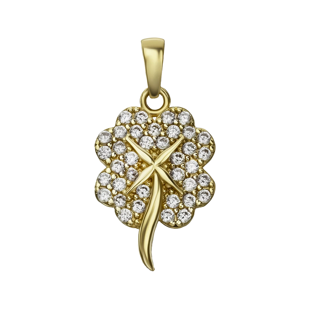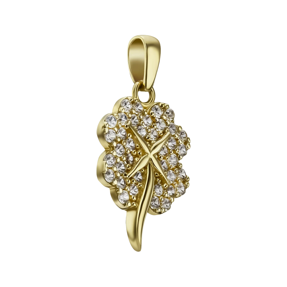 <p><strong>Размер:</strong></p> <p>длина – 15 мм</p> <p>ширина – 11 мм</p> <h2><strong>Золотая подвеска с фианитами</strong></h2> <p>Подвеска создана из желтого золота 585 пробы в изящном, очень женственном дизайне. Она имеет вид четырехлистного клевера с волнистым стебельком и изящными элементами, образующими сердцевину. Площадь всех листочков покрыта прозрачными фианитами, установленными в металл с помощью закрепки Паве, для которой характерна высокая надежность и безусловная эстетичность. Подвеска в таком исполнении является не только красивым украшением, но и амулетом «на удачу». Ведь если верить в символику четырехлистника, он способен привлечь успех к человеку, который его носит. Золотое изделие великолепно выглядит с минималистичными цепочками, которые не будут отвлекать от его красоты. Оно одинаково достойно как базового повседневного гардероба, так и роскошного вечернего наряда.</p>