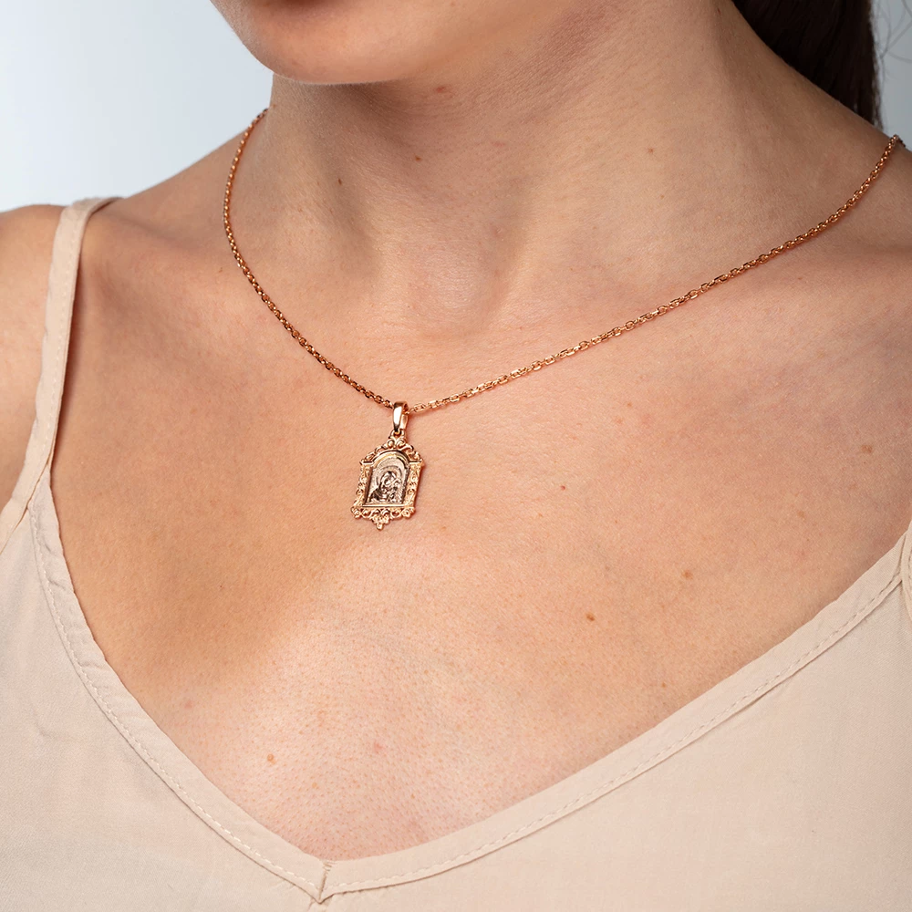 <p><strong>Размер:</strong></p> <p>высота без ушка – 22 мм</p> <p>высота с ушком – 30 мм</p> <p>ширина – 14 мм</p> <p>размеры ушка – 3 мм</p> <h2><strong>Золотая подвеска-ладанка</strong></h2> <p>Подвеска-ладанка, посвященная Богородице, изготовлена из красно-белого золота 585 пробы. Она будет хорошим выбором для каждой женщины или ребенка, ведь Матерь Божья призвана оберегать каждого, кто нуждается в защите и поддержке. На лицевой стороне изделия изображена икона Богородицы с младенцем. На поверхность другой стороны нанесены молитвенные слова «Пресвята Богородице, спаси нас». Золотое «кружево», украшающее подвеску по всему ее периметру, придает женственности нательному аксессуару. Покрытая родием, драгоценность надолго сохранит свою эстетичность и целостность. Ладанка станет не только символом веры и оберегом, но и красивым украшением, подходящим под любой наряд. Достаточно широкое ушко позволит носить изделие на цепочке разного типа плетения.</p>