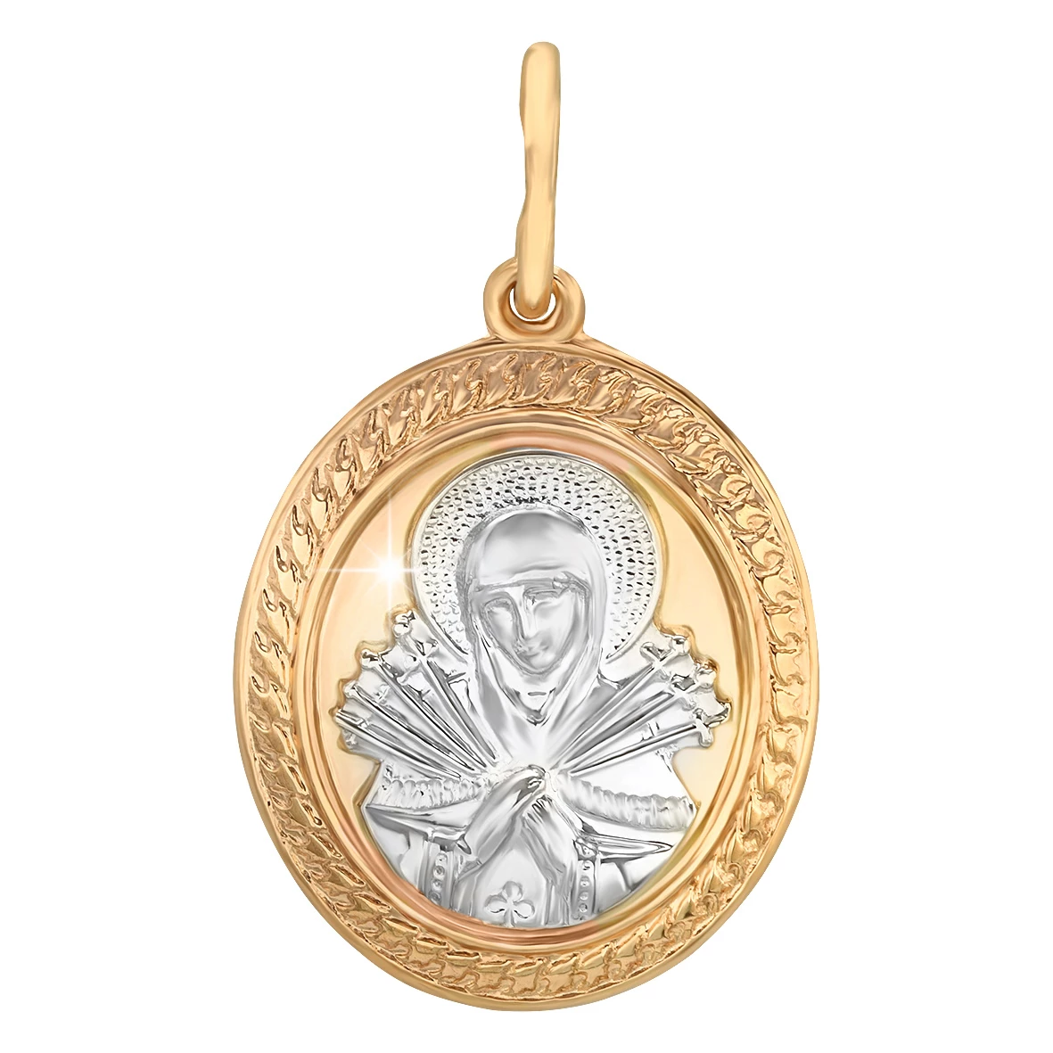 <p><strong>Размер:</strong></p> <p>высота без ушка - 17 мм</p> <p>высота с ушком - 24 мм</p> <p>ширина - 13 мм</p> <p>ушко - 5*3 мм</p> <h2><strong>Золотая подвеска-ладанка Божья Матерь «Семистрельная».</strong></h2> <p>Изысканная ладанка изготовлена из красного золота 585 пробы. Она представлена в лаконичном дизайне: Божью Матерь, символически изображенную пронизанной семью стрелами, окутывает выгравированная рамочка. Интересности добавляет родирование святого образа, благодаря чему изделие приобретает контрастность и привлекает внимание.</p> <p>Пресвятой Богородице в чудотворной иконе «Семистрельная» молятся, чтобы остановить межличностные споры, умилосердить сердца врагов, а также победить недобрые чувства и злые помыслы в собственном сердце.</p> <p>Представленная модель идеально подойдет для ежедневного ношения. На сайте к ней можно подобрать золотую цепочку классического плетения.</p>