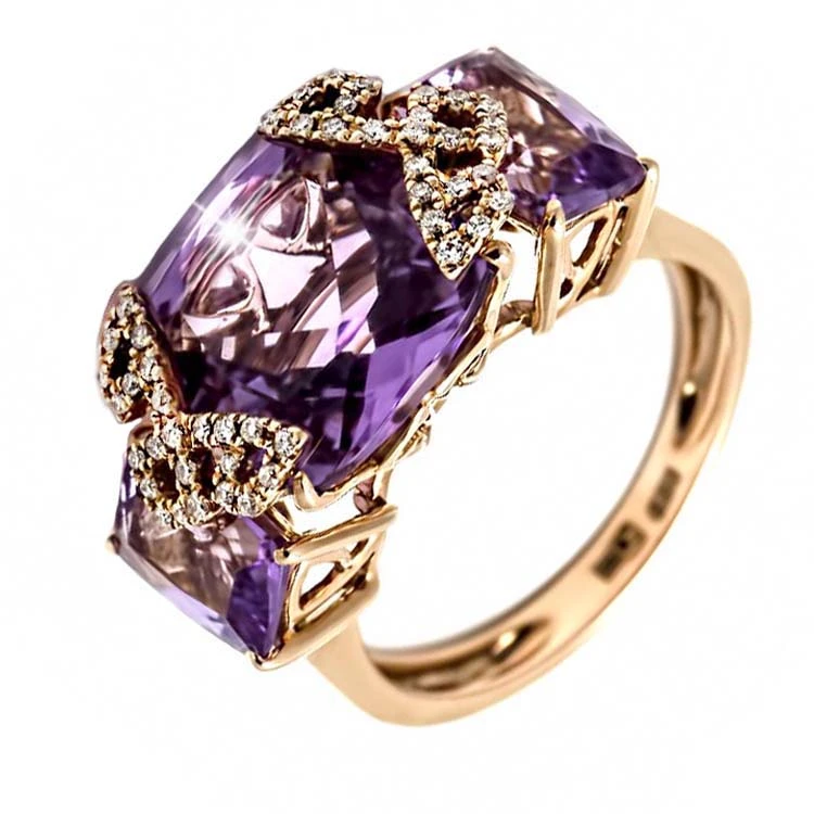 Кольцо в красном золоте 585 пробы с аметистами и бриллиантами. Яркое украшение на любое торжество. Изысканное кольцо подчеркнет изящность рук, придаст Вам сияние и блеск от которого не отвести глаз.