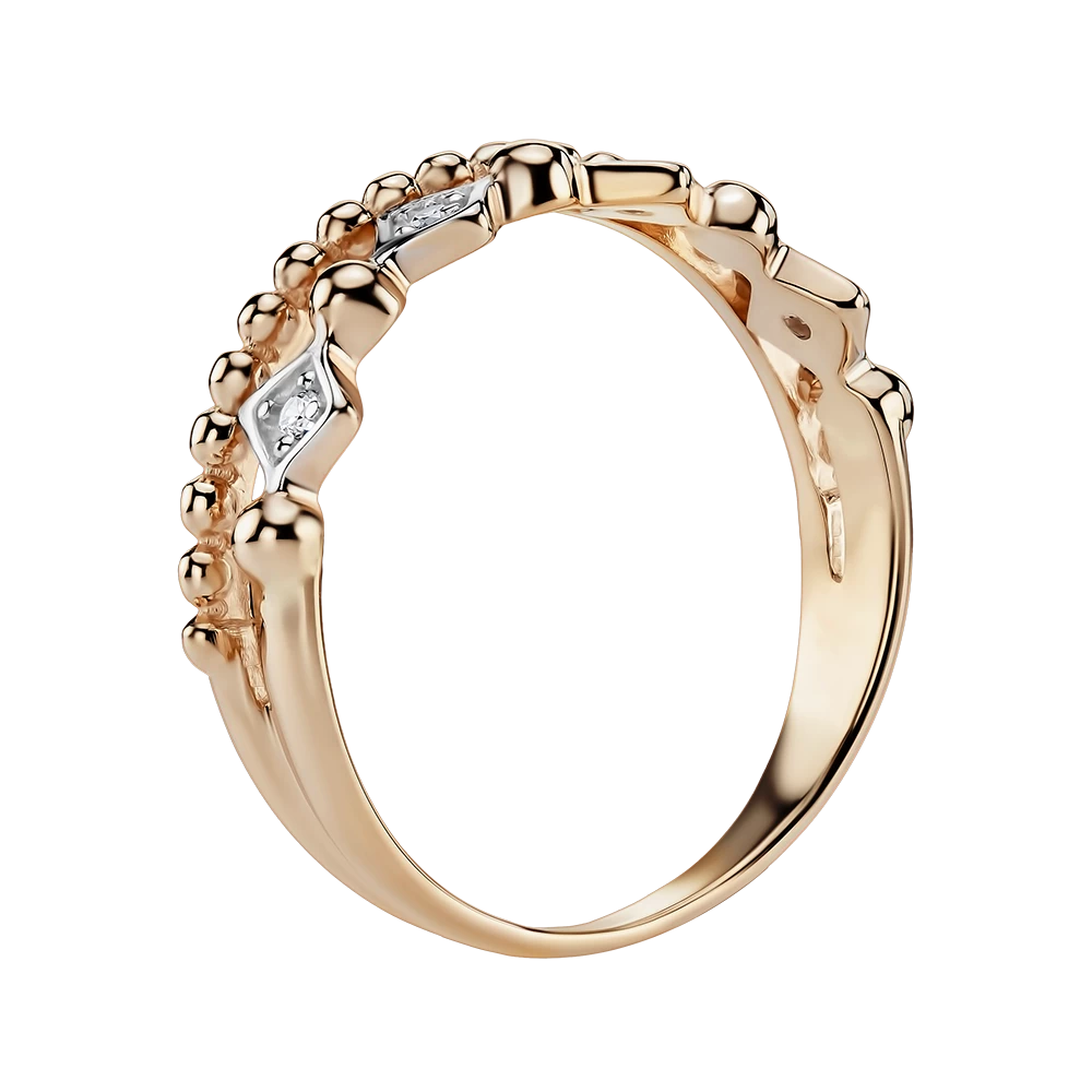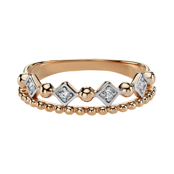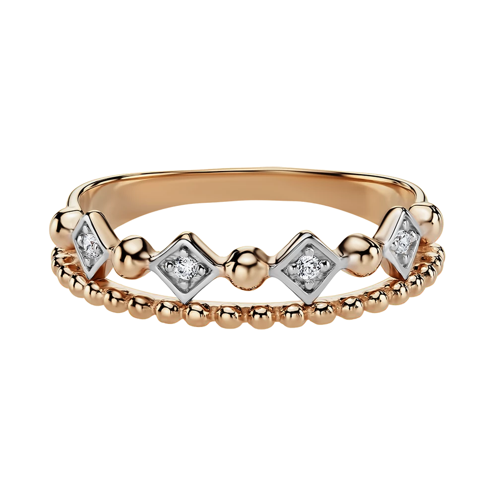 <p><strong>Размер:</strong></p> <p>Шинка - 2 мм</p> <p>Декоративный элемент – 4 мм</p> <h2><strong>Золотое кольцо с фианитом</strong></h2> <p>Изящное кольцо визуально сочетает в себе два украшения с геометрическими узорами. Изделие имеет красный цвет золота 585 пробы и ромбы, чередующиеся с шариками, покрыты белым родием и украшены фианитами. Кольцо отлично сочетается с аксессуарами в стиле минимализм и вариантами с инкрустацией. Повседневная одежда или более деловой образ достойно подчеркнет аккуратное кольцо, которое также достаточно комфортно благодаря отсутствию объемных элементов</p>