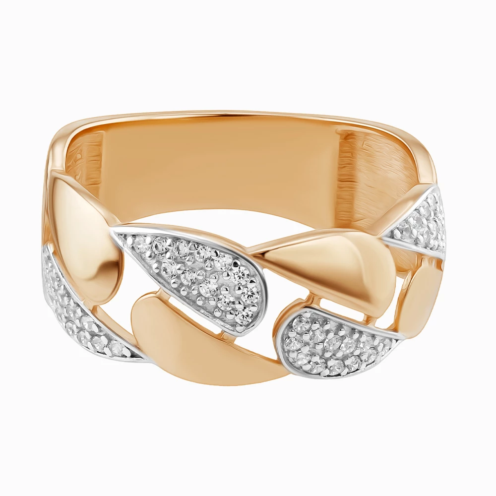 <p><strong>Размер:</strong></p> <p>ширина шинки — 6-8 мм</p> <h2><strong>Золотое кольцо с фианитами</strong></h2> <p>Изысканное кольцо изготовлено из красного золота 585 пробы – сочетание благородного блеска и изящного дизайна. Его оригинальный узор в виде плавных, природных линий напоминает капли, что гармонично комбинируются с инкрустацией ярких фианитов. Блестящие камни создают эффект сияния, придавая украшению праздничности и элегантности, одновременно сохраняя легкость и женственность. Это кольцо идеально дополнит как повседневный образ, так и станет эффектным акцентом в вечернем наряде. Оно будет подходить женщине, которая ценит утонченную красоту, мягкую геометрию и современную интерпретацию классики.</p>