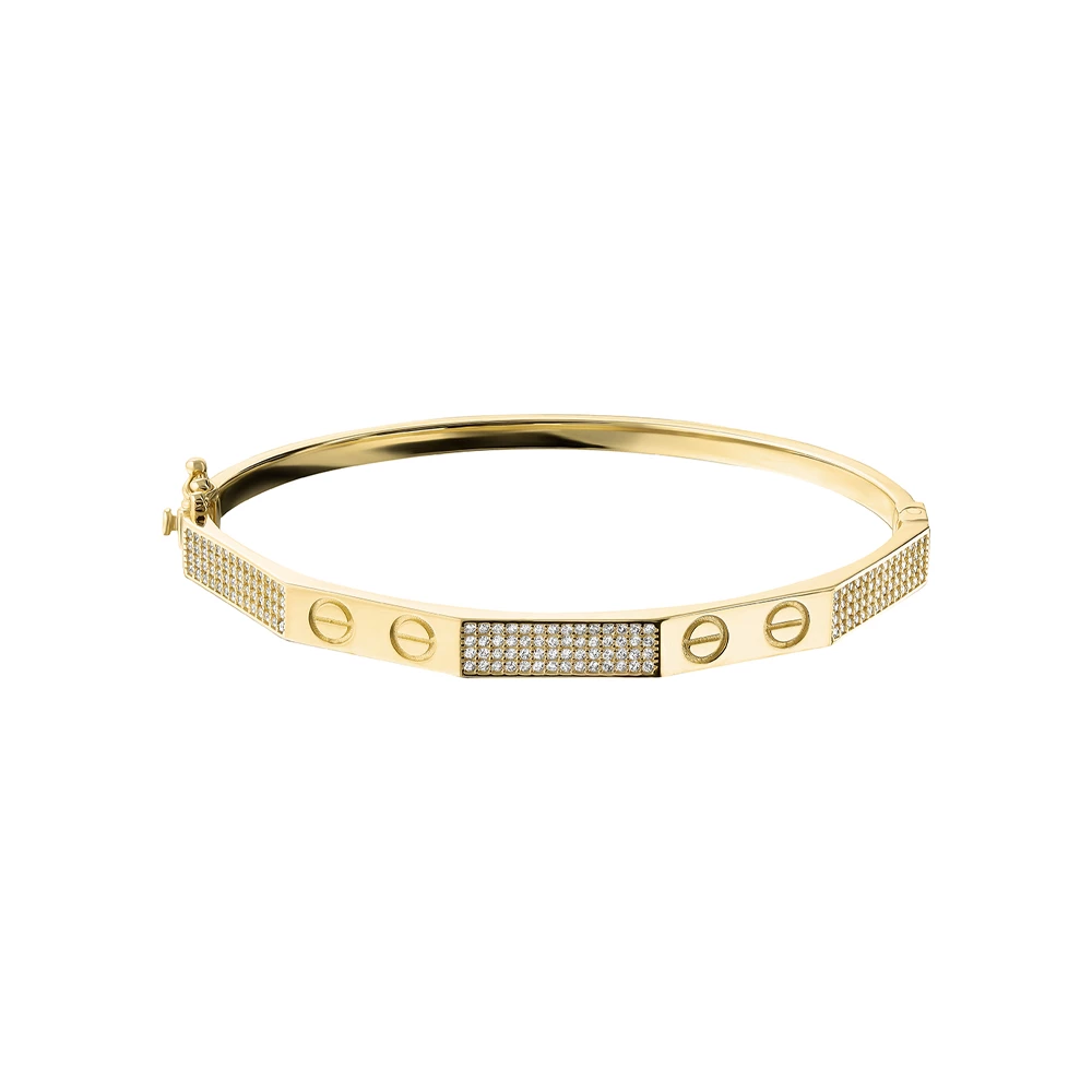 <p><strong>Размер:</strong></p> <p>Ширина браслета 3мм-5мм.</p> <h2><strong>Золотой браслет с фианитом</strong></h2> <p>Утонченная модель браслета выполнена в желтом цвете золота 585 пробы. Дизайн сочетает в себе стильные гравировки со вставками мерцающих фианитов, которые расположены дорожками. Вставки закреплены корнеровым закрепом, который надежно фиксирует фианиты и придает сияние. Данная модель браслета является вариантом жесткого шарнирного браслета, состоящего из двух половинок соединенных с одной стороны шарниром. Застежка в данной модели коробчатый замок с предохранителем, он надежный и практичный в процессе ношения украшения. Браслет будет трендово и невероятно красиво выглядеть на руке, дополнит любой Ваш образ и станет изюминкой Вашего стиля.</p>