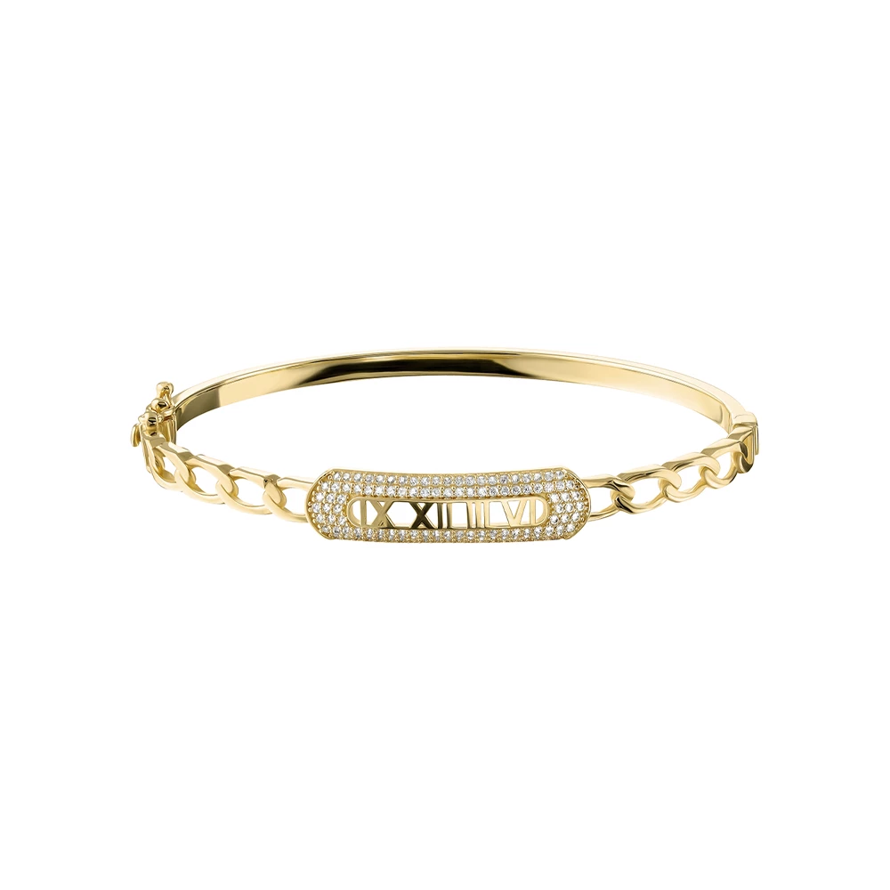 <p><strong>Размер:</strong></p> <p>Ширина – 3 мм</p> <p>Диаметр – 50 мм х 60 мм</p> <p>Декоративный элемент – 7 мм х 25 мм</p> <h2><strong>Золотой браслет с фианитом</strong></h2> <p>Нежный браслет изготовлен из желтого золота 585 пробы и имеет жесткую форму. Две его части соединены шарнирами и благодаря этому изделие удобно надевать. Замок-коробка имеет предохранитель, чтобы изделие было максимально надежно зафиксировано. Декоративная часть в виде панцирного плетения комбинируется с изображением римских цифр, а также сияющими фианитами. Украшение подходит к классическому стилю одежды, а также к изысканным образам</p>