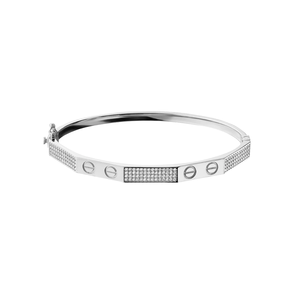 <p><strong>Размер:</strong></p> <p>Ширина – 2 мм</p> <p>Ширина декоративной части со вставками – 5 мм</p> <h2><strong>Золотой браслет с фианитом плетения Фантазийное.</strong></h2> <p>Эффектный браслет в белом родированном золоте 585 пробы имеет жесткую форму и надевается через запястье, что очень комфортно. Для этого используется шарнир, соединяющий две части изделия и отвечающий за возможность раскрывать браслет на максимум. Коробчатый замок надежно фиксирует браслет на руке, ведь одна часть браслета входит в отверстие, находящееся с другой стороны и фиксируемое предохранителем. Изделие украшено россыпью фианитов в корнерах, которые расположены довольно близко и тем самым создают бесконечное сияние.</p>