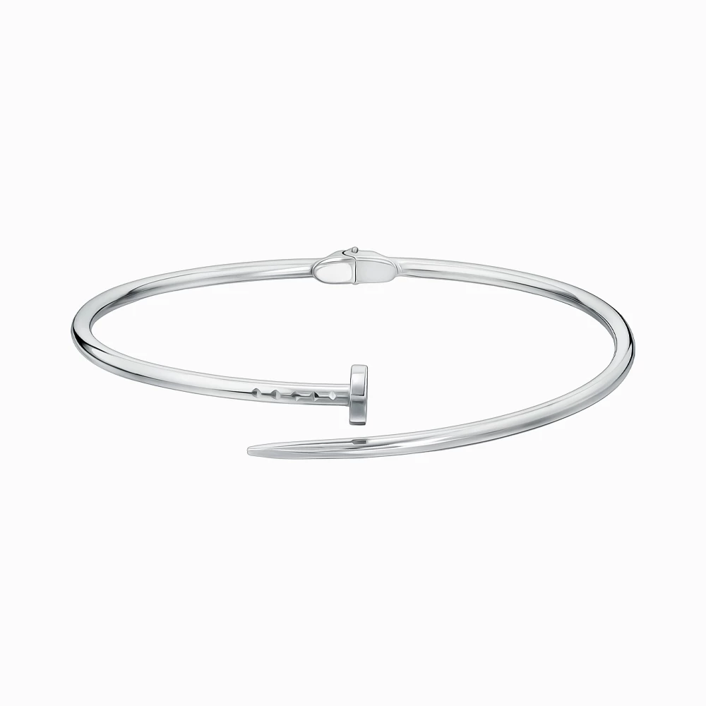 <p><strong>Размеры:</strong></p> <p>Ширина браслета 3мм.</p> <h2><strong>Золотой браслет</strong></h2> <p>Трендовая модель браслета выполнена в белом цвете золота 585 пробы. Благодаря технологии родирования изделие имеет привлекательный металлический оттенок и блеск. Украшение представлено в виде гвоздя, который выглядит реалистично. Браслет сделан шарнирным, состоит из двух половинок, соединенных между собой шарниром с одной стороны. Данный тип браслета незамкнут. Это трендовое украшение обязательно должно быть в вашем ювелирном гардеробе, им можно стилизовать как повседневный стиль так и деловой или вечерний. Украшения в виде гвоздя уже не один год находятся на пике популярности. К браслету предлагаем добавить кольцо и серьги и сделать ваш образ более акцентным.</p>
