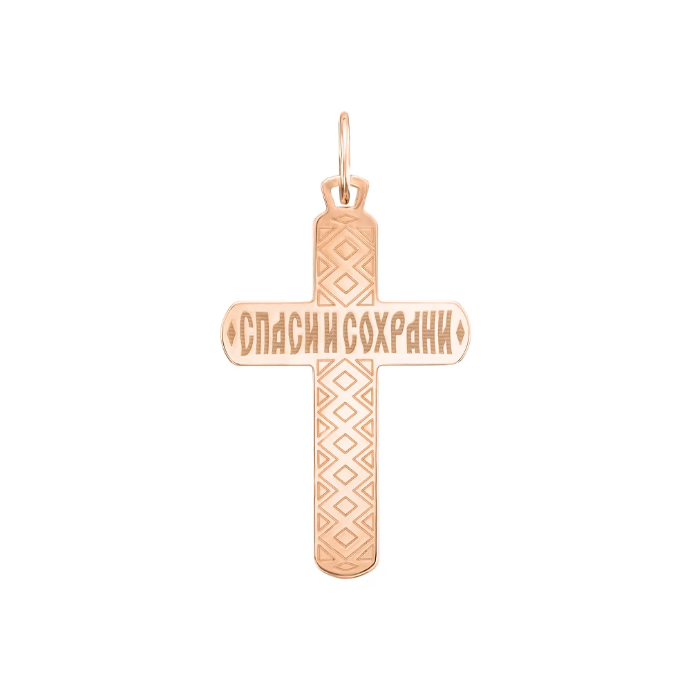 <p><strong>Размер:</strong></p> <p>Ширина 2,1 см</p> <p>Высота с ушком 4,0 см</p> <p>Высота без ушка 3,4 см</p> <p>Размер ушка 0,8 мм * 0,6 мм</p> <h2><strong>Золотой крестик.</strong></h2> <p>Для ценителей практичных и лаконичных по дизайну украшений, мы предлагаем нашу новинку - элегантный нательный крестик, изготовленный из красного золота 585 пробы с использованием техники алмазной грани. Передняя сторона украшения полностью гладкая, без дополнительных вставок, что позволяет яркому золоту выгодно отражать свет и сверкать. Подобная стремительность в дизайне позволит украшению удовлетворить эстетические потребности любого владельца, а благодаря удобной петельке вы можете носить его с любым шнуром или цепочкой.</p> <p>На оборотной стороне подвеска украшена ажурным гравированным орнаментом и надписью "Спаси и сохрани" на русском языке.</p>