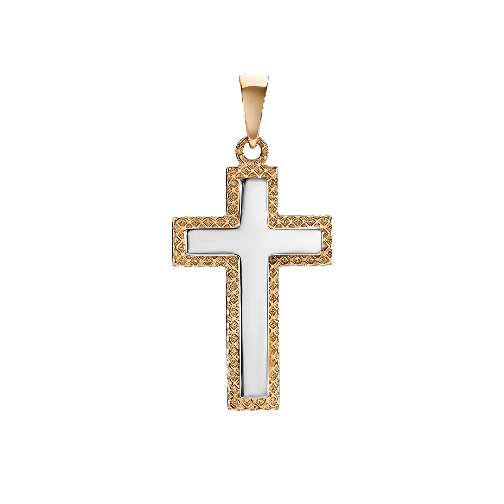 <p><strong>Размер:</strong></p> <p>ширина - 17 мм</p> <p>длина с ушком - 33 мм</p> <p>длина без ушка - 26 мм</p> <h2><strong>Золотой крестик.</strong></h2> <p>Изящный декоративный крестик изготовлен из красно-белого золота 585 пробы. Сочетание разных цветов металла делает украшение более элегантным и неповторимым, а лаконичные выгравированные узоры по контуру добавляют эффектности и блеска.</p> <p>Этот крестик прекрасно подойдет для ежедневного ношения. На сайте к нему можно подобрать аккуратную цепочку или текстильный шнурок с золотыми вставками, тогда вы получите замечательный аксессуар, который дополнит ваш уникальный стиль, сделав его еще более выразительным и эффектным.</p>