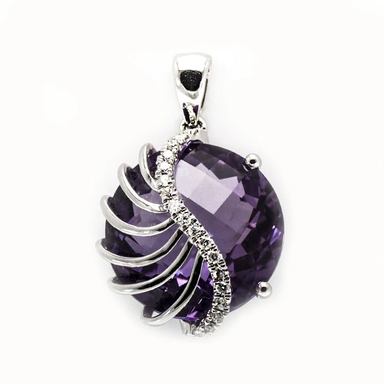Подвес в белом золоте 585 пробы с бриллиантами и аметистом - яркое, стильное украшение. Прекрасно сочетается с цепями в белом золоте с алмазной гранью.