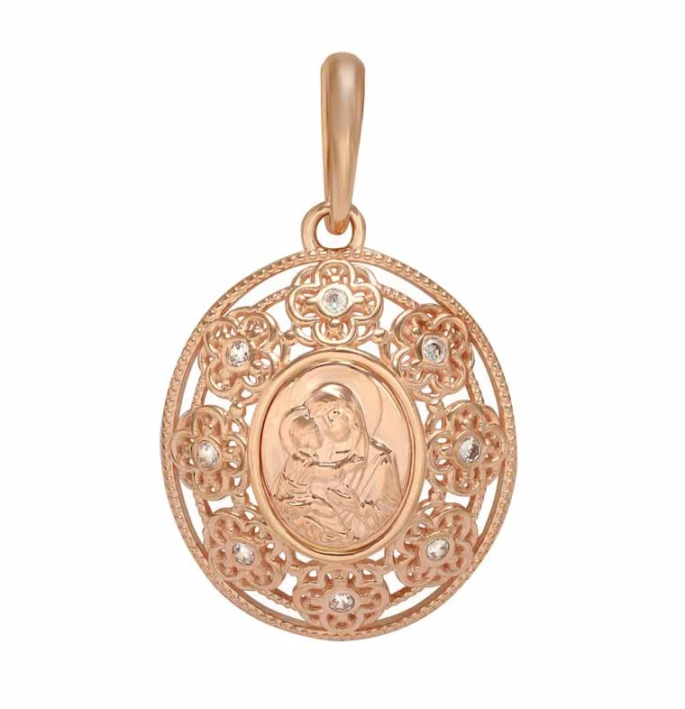 <p><strong>Размеры:</strong></p> <p>длина с ушком – 3,5 см;</p> <p>длина без ушка – 2,5 см;</p> <p>ширина – 2 см;</p> <p>ушко – 1 мм;</p> <p>вставка – фианит - 2 мм.</p> <h2><strong>Золотая подвеска с фианитом</strong></h2> <p>Подвеска изготовлена из красного золота 585 пробы, декорирована фианитами круглой огранки. Изделие имеет овальную форму, в центре композиции находится искусно выполненное изображение Пресвятой Девы Марии с младенцем Иисусом на руках. Вокруг этого изображения расположены ажурно изготовленные цветы, в сердцевине которых размещены камни фианита.</p> <p>Украшение можно носить в качестве оберега, подобрав к нему подходящую цепочку из красного золота или ювелирный шнурок. Их вы в большом ассортименте найдете у нас на сайте в каталоге онлайн.</p> <p>Аксессуар подходит к одежде разных стилей. Подвеска идеально подойдет для повседневного использования.</p>