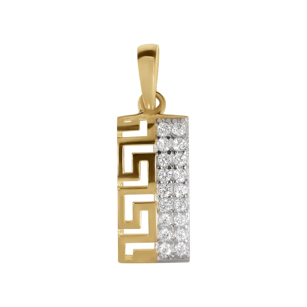 <p><strong>Размер:</strong></p> <p>ширина - 7 мм</p> <p>длина с ушком - 20 мм</p> <p>длина без ушка - 14 мм</p> <h2><strong>Золотая подвеска с кубическим оксидом циркония.</strong></h2> <p>Изысканная подвеска изготовлена из красного золота 585 пробы.</p> <p>Дизайн украшения чрезвычайно изысканный и стильный: с одной стороны размещен греческий орнамент «Меандр», а с другой — две дорожки сияющих фианитов круглой огранки, которые закреплены корнерами.</p> <p>Ювелирная подвеска с узором «Меандр» может стать отличным подарком для близких. Греческий орнамент символизирует бесконечность, поэтому с помощью этого украшения можно выразить свое особое отношение и чувства. К изделию подойдет аккуратная золотая цепочка классического плетения, которую вы можете выбрать на нашем сайте.</p>