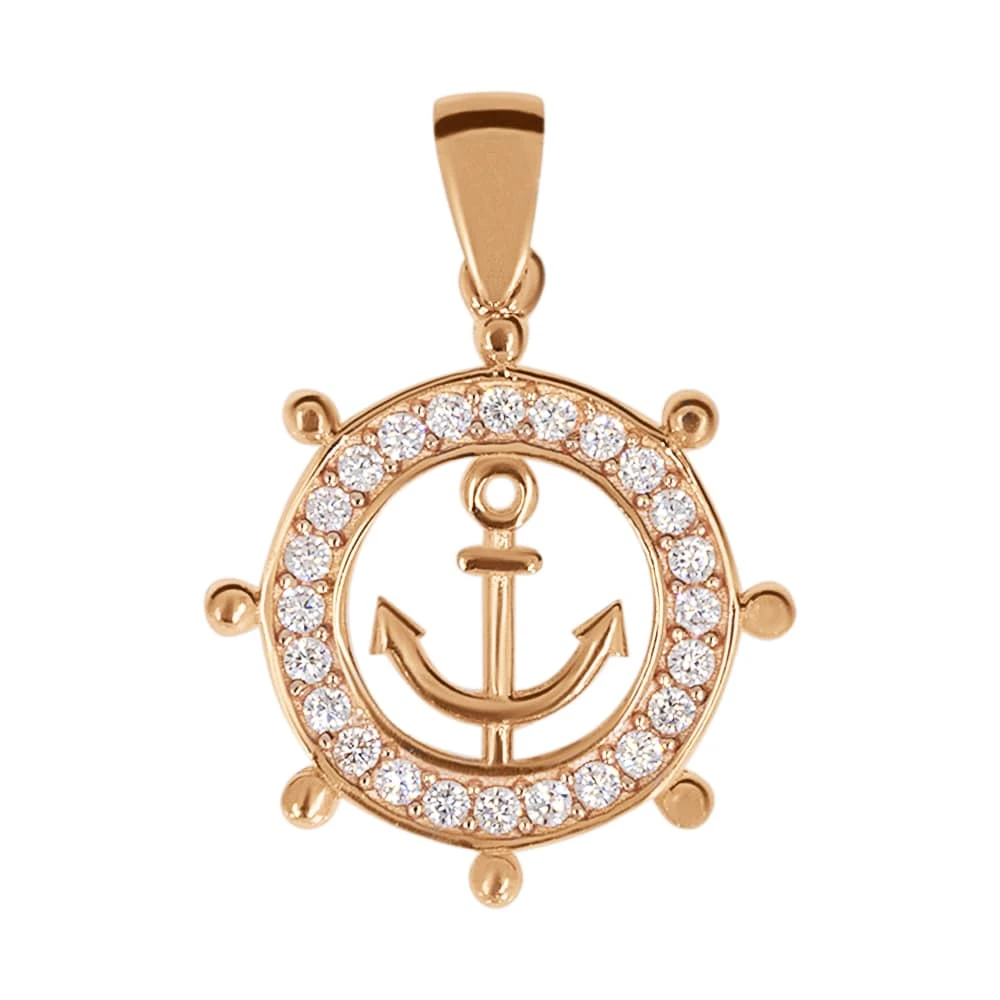 <p><strong>Размеры:</strong></p> <p>Длина без ушка – 1,4 см</p> <p>Длина с ушком – 2,0 см</p> <p>Ширина – 1,3 см</p> <p>Размер ушка – 6х3 мм</p> <h2><strong>Золотой подвес с фианитом.</strong></h2> <p>Представленное изделие изготовлено из красного золота 585 пробы. Подвес выполнен в форме рулевого колеса корабля, а в середине композиции изображен якорь, являющийся олицетворением надежности и стойкости. По всему периметру «рулевого колеса» имеются вставки в виде искусственного камня – фианита. Этот камень, который также называют кубический оксид циркония, прочен, долговечен и имеет ослепительно яркий блеск, соотносимый с блеском бриллианта.</p> <p>Украшение выглядит оригинально и подходит ко всем стилям одежды – от модерна до классики. К подвесу можно подобрать цепочку из красного золота либо ювелирный шнурок. Все эти товары вы найдете на нашем сайте в широком ассортименте.</p>