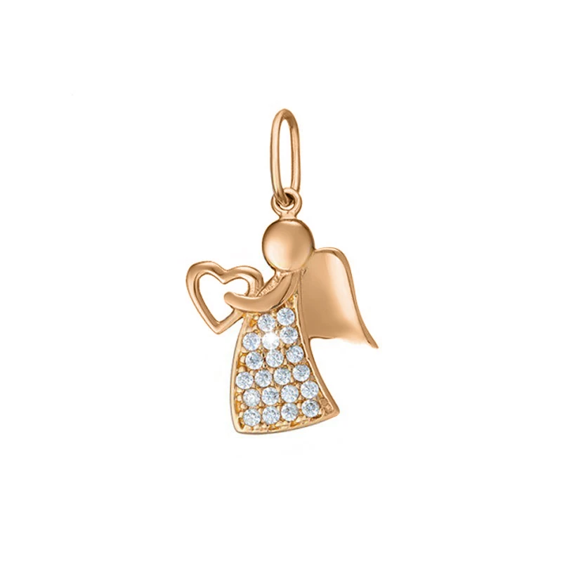 Подвеска «Ангел» из красного золота 585 пробы с сердечком, сияющими фианитами, станет прекрасным оберегом и оригинальным дополнением к вашему образу. Изысканная подвеска в виде миниатюрного ангела, держащего в руках сердце, подчеркнет красоту и юной девушки, и более взрослой женщины.
