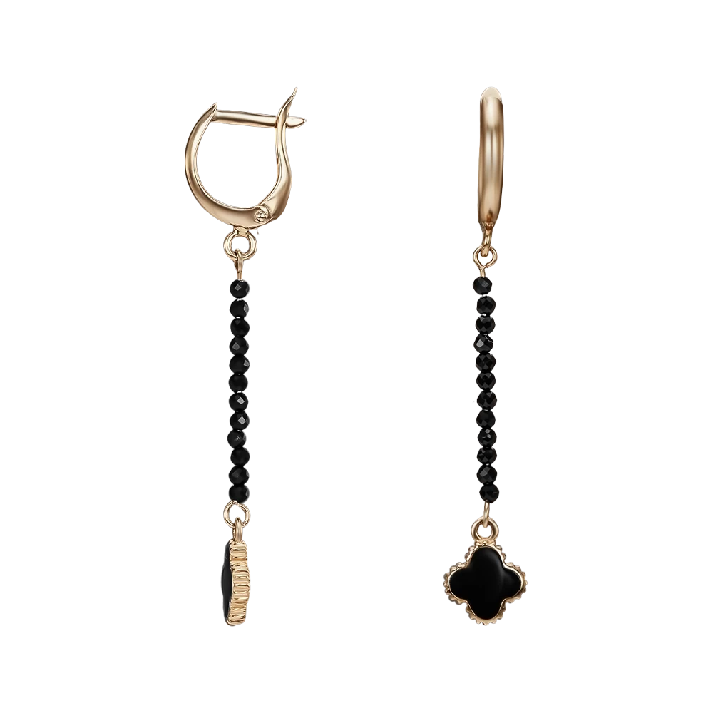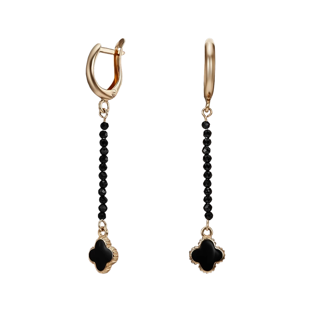 <p><strong>Размер:</strong></p> <p>Длина крючка до застежки – 8 мм</p> <p>Длина серьги без подвесной части – 12 мм</p> <p>Ширина серьги без подвесной части – 3 мм</p> <p>Длина подвесной части – 65 мм</p> <p>Ширина подвесной части – 7 мм</p> <h2><strong>Золотые серьги с агатом.</strong></h2> <p>Серьги с агатом есть среди аксессуаров волевых личностей, обладающих лидерскими качествами. Этот непрозрачный камень обеспечивает хорошее самочувствие и помогает оградиться от негативной энергетики. Украшение из красного золота 585 пробы имеет надежную английскую застежку, где штифт расположен ниже, чем начинается основная часть серьги, чтобы они аккуратно прикрывали отверстие в ухе и не провисали. Подвесная часть из агата сочетает основу серьги с декоративным элементом в виде четырехлистника с эмалью, который является олицетворением успеха и помогает в осуществлении мечты.</p>