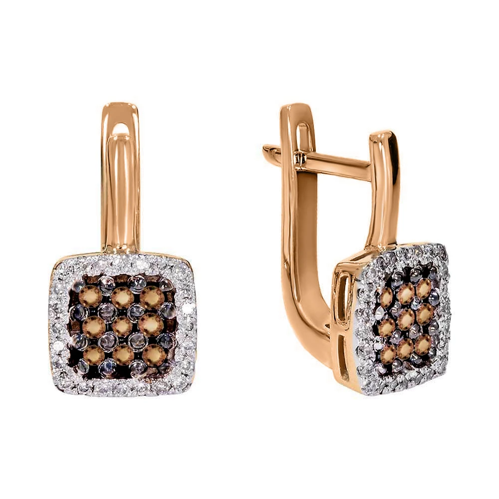 Золотые серьги с бриллиантами. Серьги изготовлены из золота 585 пробы с английским замком. В середине квадрата расположены коньячные бриллианты, по краям белые бриллианты. Размеры изделия: высота основы 14мм ширина основы 8мм