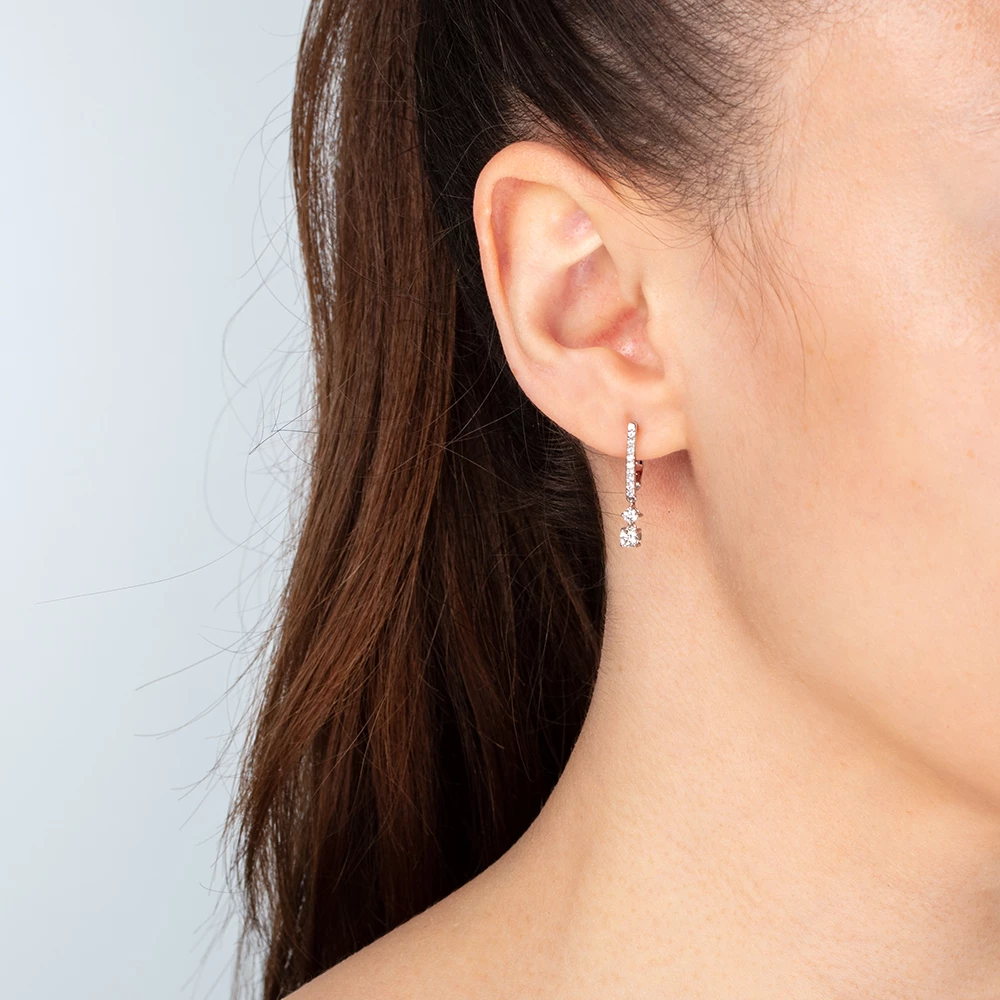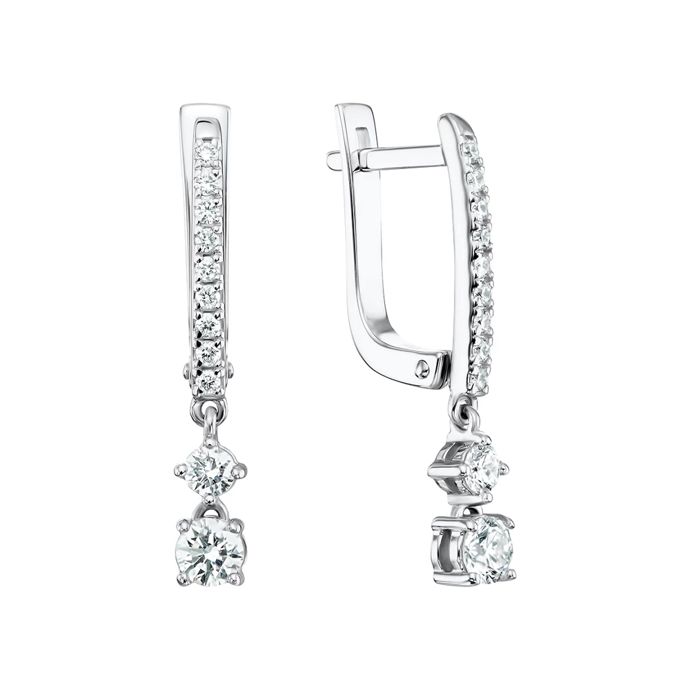 <p><strong>Размер:</strong></p> <p>Ширина серьги – 1,3 мм</p> <p>Диаметр вставки – 1 мм</p> <p>Длина подвесной части – 10 мм</p> <p>Длина крючка до застежки – 8 мм</p> <p>Длина швензы – 14 мм</p> <h2><strong>Золотые серьги с бриллиантами</strong></h2> <p>Изысканные сверкающие серьги имеют белый цвет золота 585 пробы с покрытием родия. Бриллиантами усеяна вся поверхность изделия, а подвесная часть имеет большие по размеру вставки. Классическое изделие всегда будет среди актуальных украшений и отлично завершит образ. Английская застежка считается лучшей и удобной. Также изделие идеально прилегает к уху, ведь имеет крючок, расположенный ниже начала основной части украшения</p>