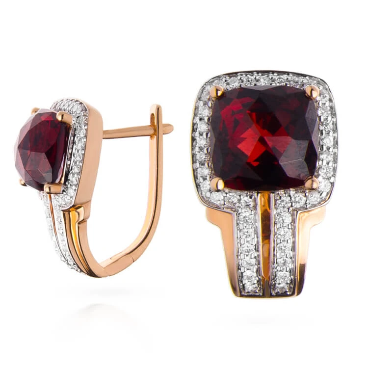 Золотые серьги с гранатом и бриллиантами. Изумительные серьги, украшенные гранатом в обрамлении бриллиантов, станут лучшим завершением романтического образа. Английский вид застежки. Размеры изделия, мм: ширина - 11,3; высота - 18,4. Размеры вставки, мм: ширина - 8; высота - 8.