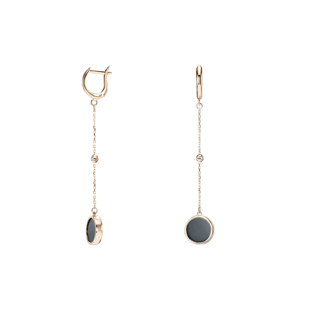 <p><strong>Размеры:</strong></p> <p>Длина серьги – 68 мм</p> <p>Длина крючка – 6 мм</p> <p>Ширина сережек - 2 мм</p> <p>Длина подвесной части – 52 мм</p> <p>Ширина подвесной части – 11 мм</p> <h2><strong>Золотые серьги-подвески с агатом</strong></h2> <p>Элегантные серьги с агатом изготовлены из красного цвета золота 585 пробы. Подвесная часть выполнена из надежного якорного плетения с центральным элементом в виде шарика с сияющей алмазной гранью. Внизу украшения черный агат расположен в ободковом касте. Этот камень является олицетворением силы воли и лидерства. Аксессуар обязательно попадет в список Ваших любимых, ведь придаст Вашему образу изысканности и нежности</p>