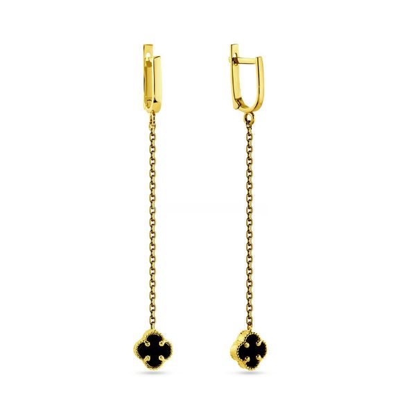 <p><strong>Размер:</strong></p> <p>Длина штифта – 8 мм</p> <p>Длина серьги – 57 мм</p> <p>Подвесная часть – 7х7 мм</p> <h2><strong>Золотые серьги-подвески с ониксом.</strong></h2> <p>Представленные серьги-подвески изготовлены из желтого золота 585 пробы. Подвес имеет форму листка клевера, вставка – оникс черного цвета. Серьги данного типа – скромны и роскошны одновременно. С одной стороны компактные размеры изделия делают его подходящим для ежедневного лука. Вместе с тем благодаря своему блистательному дизайну, аксессуар очень хорошо подойдет под замысловатое макси-платье для вечернего выхода. Ониксовая вставка придает украшению большей глубины за счет насыщенности цвета и естественной красоты натурального камня.</p> <p>Наличие английской застежки делает использование серег максимально комфортным и безопасным.</p>