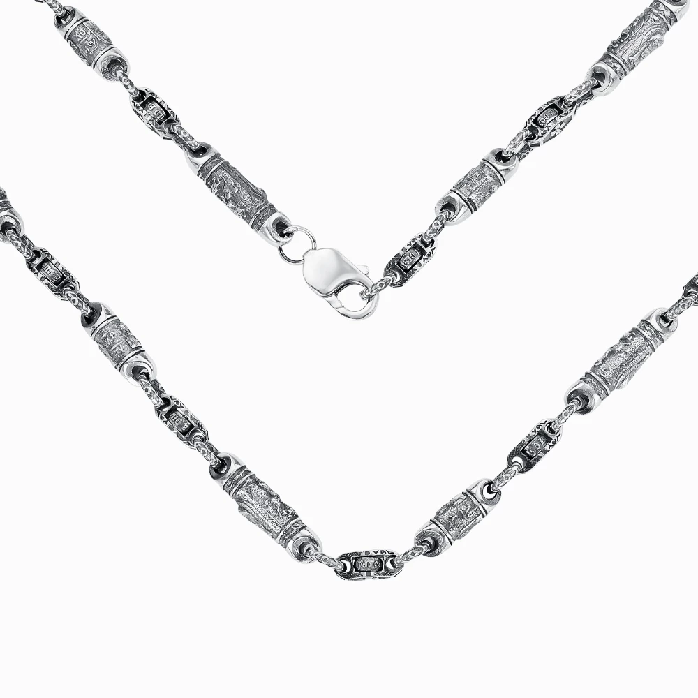 <p><strong>Размеры:</strong></p> <p>фантазийное плетение;</p> <p>1 бочонок - 2,5 см х 6 мм;</p> <p>2 боч. - 1,2 см х 5 мм;</p> <p>звено - 6 х 2 мм</p> <h2><strong>Серебряная цепочка</strong></h2> <p>Эта стильная цепочка из родированного чернёного серебра 925 пробы создана для тех, кто ценит выразительные и брутальные украшения. Дизайн выполнен в виде чередующихся звеньев цилиндрической формы с узорной гравировкой. Подобное исполнение придаёт изделию оригинальность, выгодно подчёркивает характер своего владельца, его безупречный вкус. Чернение усиливает глубину орнамента, делает контраст более заметным. Надёжный замок-карабин гарантирует удобство и безопасность при носке. Универсальный аксессуар в стиле унисекс легко дополнит повседневный образ, либо станет уместным и актуальным акцентом для выходного лука.</p>