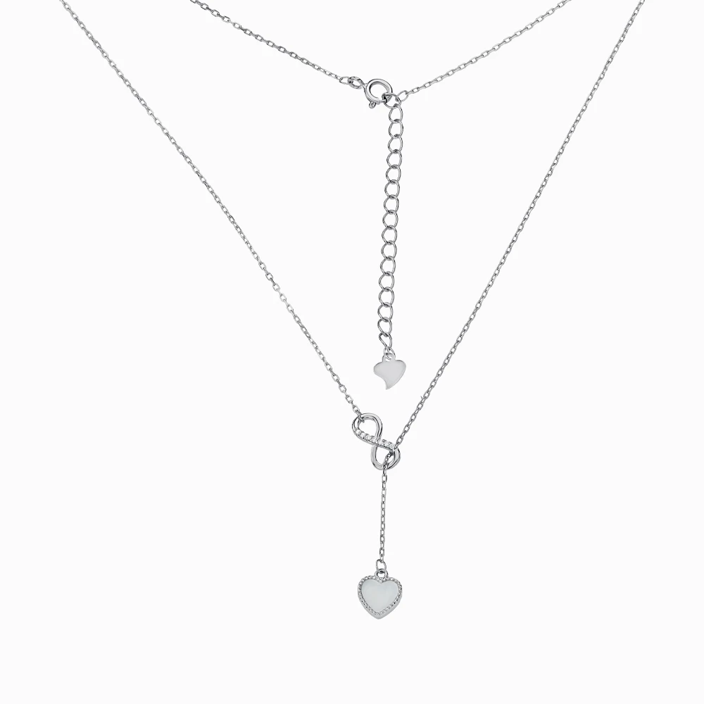 <p><strong>Размеры:</strong></p> <p>Декоративная часть сердце: 6 мм</p> <p>Знак бесконечности: 1 см х 4 мм</p> <h2><strong>Серебряное колье с перламутром</strong></h2> <p>Романтичное женственное колье, которое объединяет нежность форм и глубину смысла. Изготовлено из серебра 925 пробы и дополнено изящным якорным плетением, которое гармонично подчёркивает элегантность украшения. Центральный акцент — подвес в форме сердца с перламутром, обрамлённый россыпью мелких фианитов, придающих украшению блеск и утончённое сияние. Особенно выразительно выглядит символ бесконечности, сквозь который словно проходит цепочка — это создаёт ощущение единства, связи и непрерывности. Символ также инкрустирован фианитами, которые мерцают при каждом движении, добавляя лёгкое сияние и эмоциональный акцент. Колье застёгивается на шпрингельный замок — надёжный, удобный и практичный для повседневного ношения. Он прочно фиксируется, обеспечивая комфорт и уверенность в любой ситуации. Это украшение станет идеальным подарком для особенного человека или трогательным напоминанием о собственных чувствах. Колье прекрасно дополняет романтичные и классические образы, придавая им особый смысл и тепло.</p>