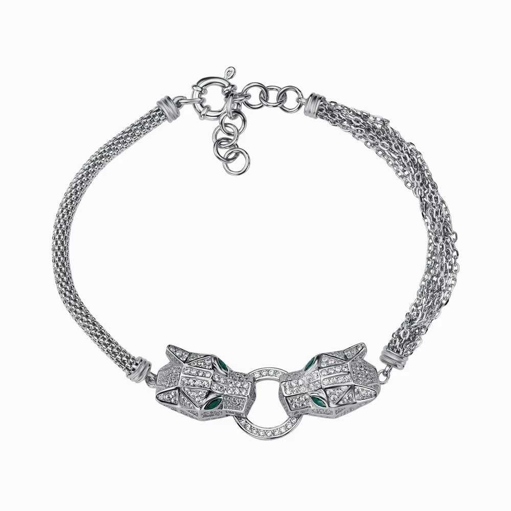 <p><strong>Размеры:</strong></p> <p>длина –19,5 см;</p> <p>ширина – 5 мм; 3 мм.</p> <p>Вставка: фианиты, 4 зеленых фианита – 1 х 3,5 см</p> <h2><strong>Серебряный браслет с фианитом</strong></h2> <p>Уникальный по дизайну браслет состоит из родированого серебра 925 пробы. Предназначен для ношения мужчинами, но в целом относится к изделиям унисекс. Модель выполнена креативно – две половины браслета имеют разное исполнение, что придает аксессуару необычный и интересный внешний вид. Декоративная часть представляет собой головы двух пантер, которые держат в пасти кольцо. Глаза животных украшены фианитами зеленого цвета. Головы хищников и кольцо декорированы прозрачными фианитами.</p> <p>Серебро для дополнительной защиты и более яркого сияния покрыто родием. Это обеспечивает аксессуару более долгий срок службы с сохранением всех эстетических и практических свойств. Тип замка – шпрингельный. Размер браслета регулируется при помощи звеньев, расположенных рядом с застежкой.</p> <p>Изделие сочетается со всеми стилям одежды. Идеально подходит для повседневной носки.</p>