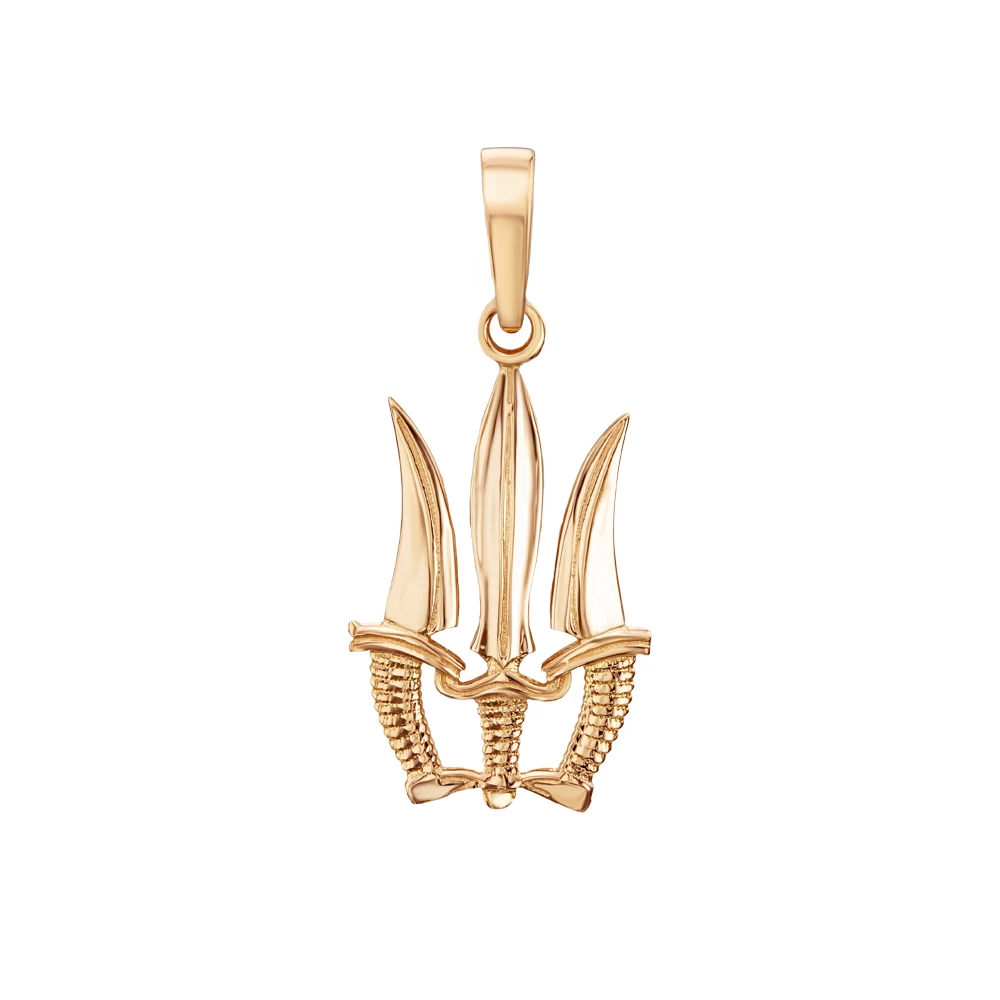 <p><strong>Размер:</strong></p> <p>длина с ушком - 2,6 см</p> <p>длина без ушка - 1,9 см</p> <p>размер ушка –7 * 3,5 мм</p> <p>ширина - 1,2 см</p> <h2><strong>Золотая патриотическая подвеска трезубец.</strong></h2> <p>Необычная патриотическая подвеска из красного золота 585 пробы. Украшение с уникальным дизайном, изображающим три кинжала, слитые в одно целое и образующие трезубец - символ Государственного Герба Украины. Она поражает своей неординарностью и глубоким национальным патриотизмом. Такая захватывающая подвеска не оставит равнодушным Ваше окружение, привлекая внимание и вызывая заинтересованные взгляды. Широкое ушко позволяет совмещать ее с цепочками любой ширины и типа плетения. Это украшение – это не только модный аксессуар, но и выражение Ваших глубоких переживаний и национальной принадлежности. Она подчеркнет Вашу индивидуальность в любом образе и станет настоящим символом Ваших ценностей и патриотизма.</p> <p>Изделие продается в фирменной упаковке «Золотая королева».</p>
