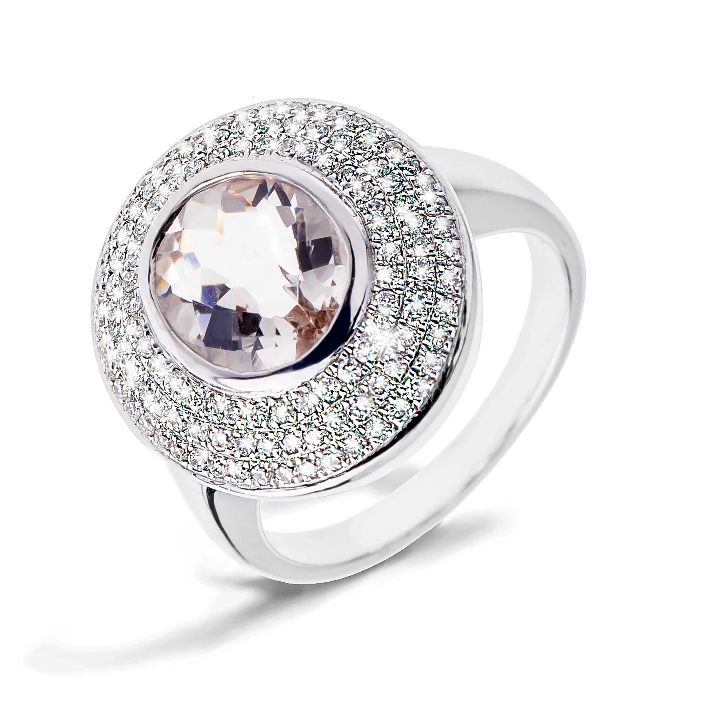 Кольцо из белого золота с бриллиантами и морганитом. Сочетание драгоценных камней с классическим стилем в кольце позволит их владелице всегда быть на пике моды. Морганит розово-коричнего цвета в форме овала переливается в обрамлении искристых алмазов на серебристо-белом фоне. Морганит- редкая разновидность минерала берилла с примесью марганца (и как мы знаем что изумруд так же драгоценный камень берилловой группы).
