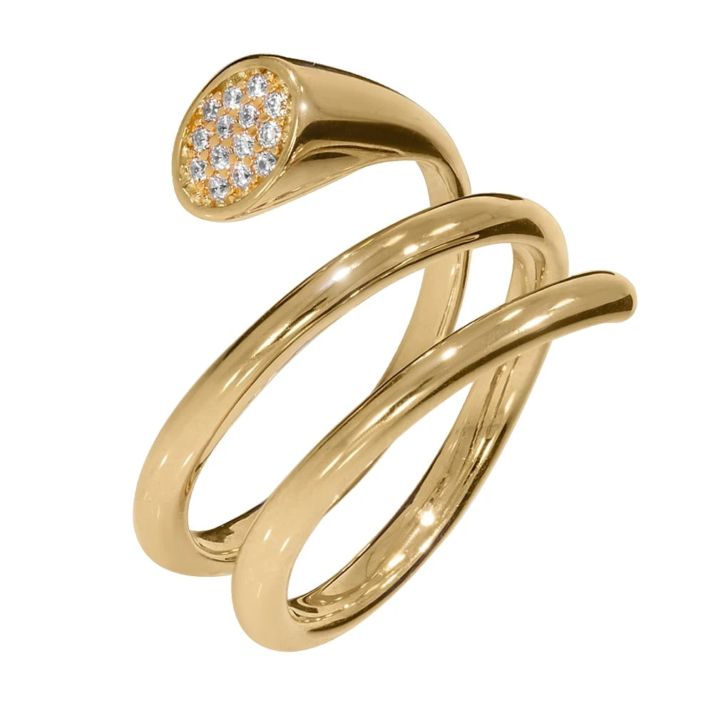 <p><strong>Размер:</strong></p> <p>самой высокой стороны &ndash; 7 мм</p> <p>самой широкой стороны &ndash; 15 мм</p> <p>вставки &ndash; 6 &times; 7 мм</p> <h2><strong>Золотое кольцо с фианитом</strong></h2> <p>Изысканное кольцо из желтого золота 585 пробы создано в виде спирали, являющейся символом духовного роста, просветления, стремления к развитию и познанию. Блестящая поверхность изделия завораживает своим мерцанием, а один край кольца украшен россыпью светлых фианитов. Такое украшение выглядит благородно, огибая пальчик своей обладательницы и подчеркивая его изящность. Кольцо роскошно смотрится в любом образе, гармонично сочетается с повседневной или вечерней одеждой. Она одинаково хорошо комбинируется и с деловым офисным костюмом, и с нарядным платьем. Драгоценность можно дополнить серьгами и цепочкой, выполненными в подобном стиле, создав элегантный комплект украшений.</p>