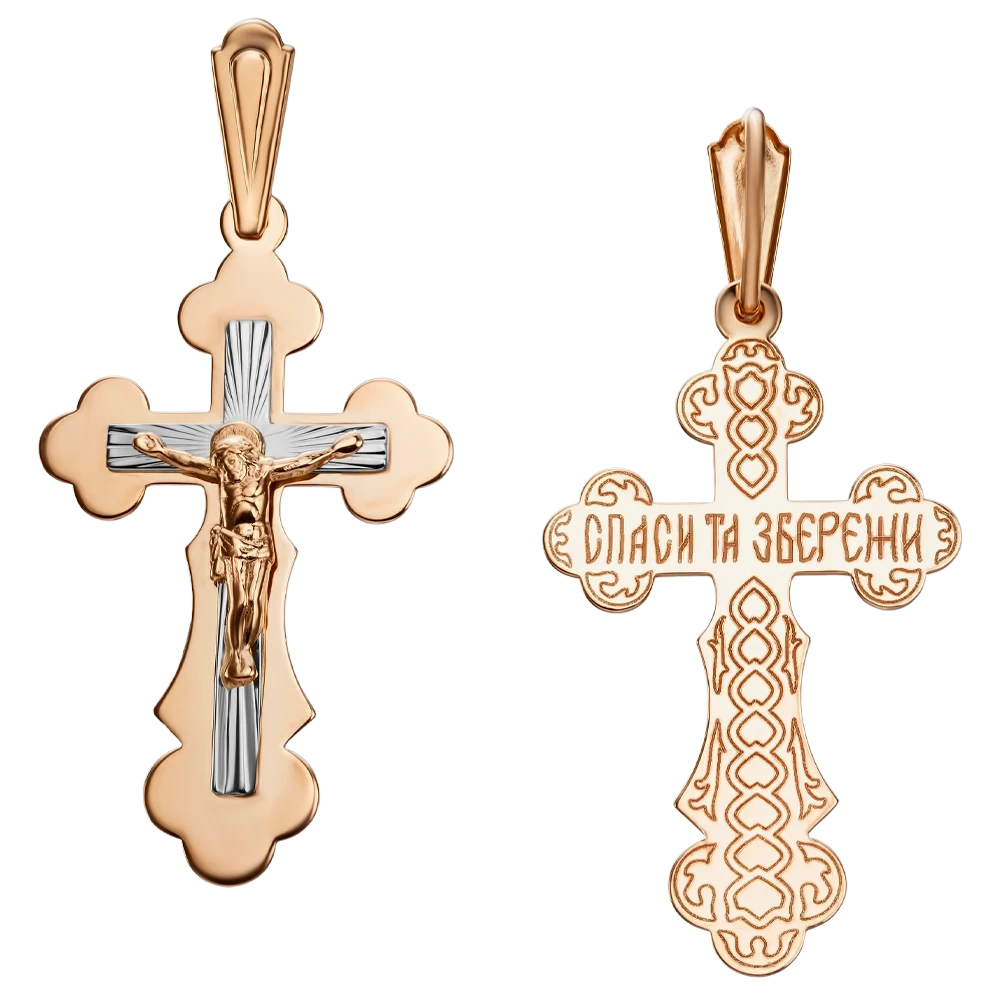 <p><strong>Размер:</strong></p> <p>ширина — 17 мм</p> <p>длина без ушка — 31 мм</p> <p>длина с ушком — 40 мм</p> <h2><strong>Золотой крестик</strong></h2> <p>Этот удивительный крестик изготовлен из комбинации красного и белого золота 585 пробы — гармоничное сочетание традиций и современного ювелирного мастерства. По центру расположено распятие Иисуса выполненное из красного золота, элемент в виде креста из белого золота покрытого родиевым покрытием, что придает ему благородный блеск и дополнительную защиту от потемнения. Форма креста отличается плавными очертаниями с изящными декоративными элементами, подчеркивающими духовную символику украшения. На обороте выгравирована сакральная надпись «Спаси та Збережи» — сильный оберег, придающий уверенность и внутренний покой. Надежное и удобное ушко позволяет легко совмещать крестик с разными цепочками. Это украшение станет не только духовным символом, но и элегантным ежедневным аксессуаром, имеющим особое содержание и эстетику.</p>