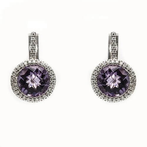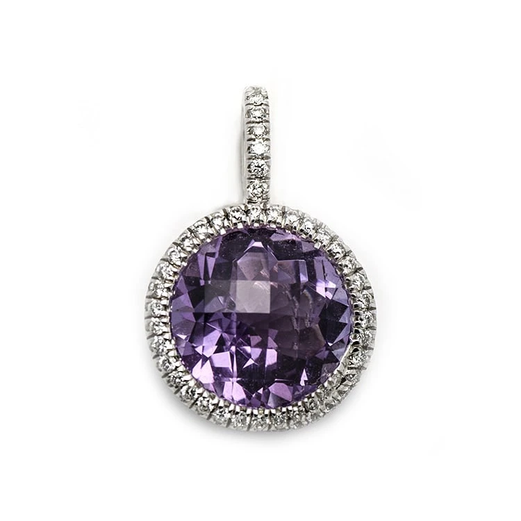 Изысканный подвес в белом золоте 585 пробы с бриллиантами и аметистом. Невозможно отвезти взгляд от блеска и разнообразной палитры фиолетового оттенка. Подвес подчеркнет цвет серых, зеленых и голубых глаз.