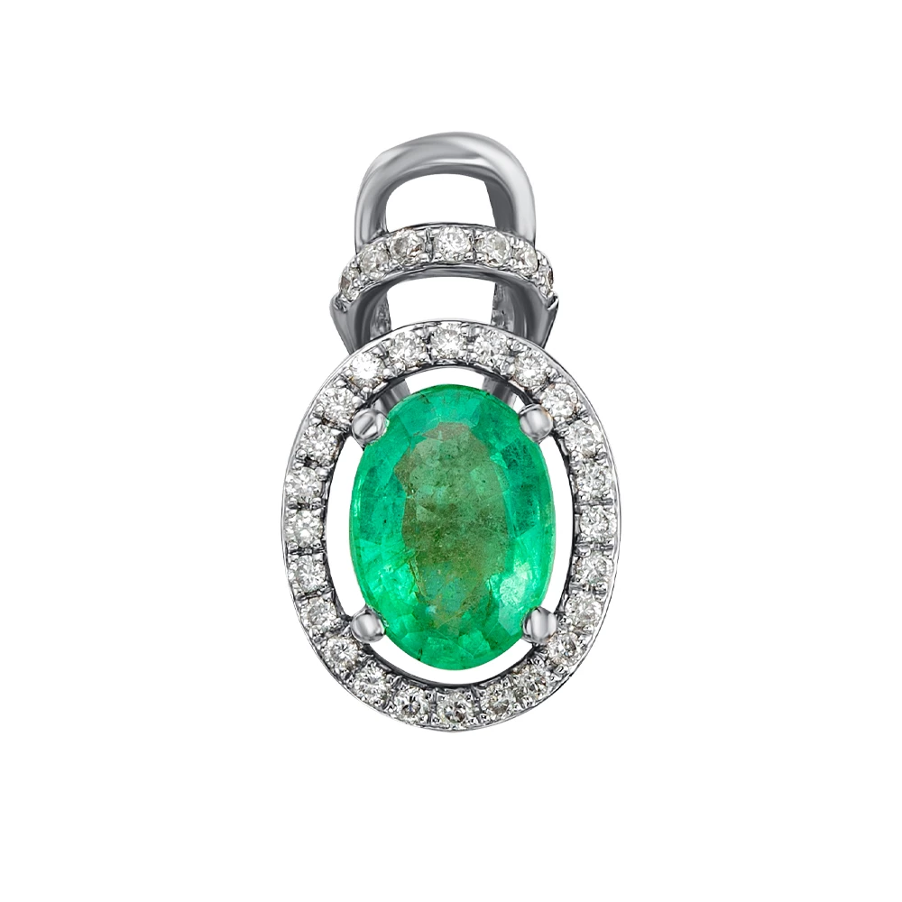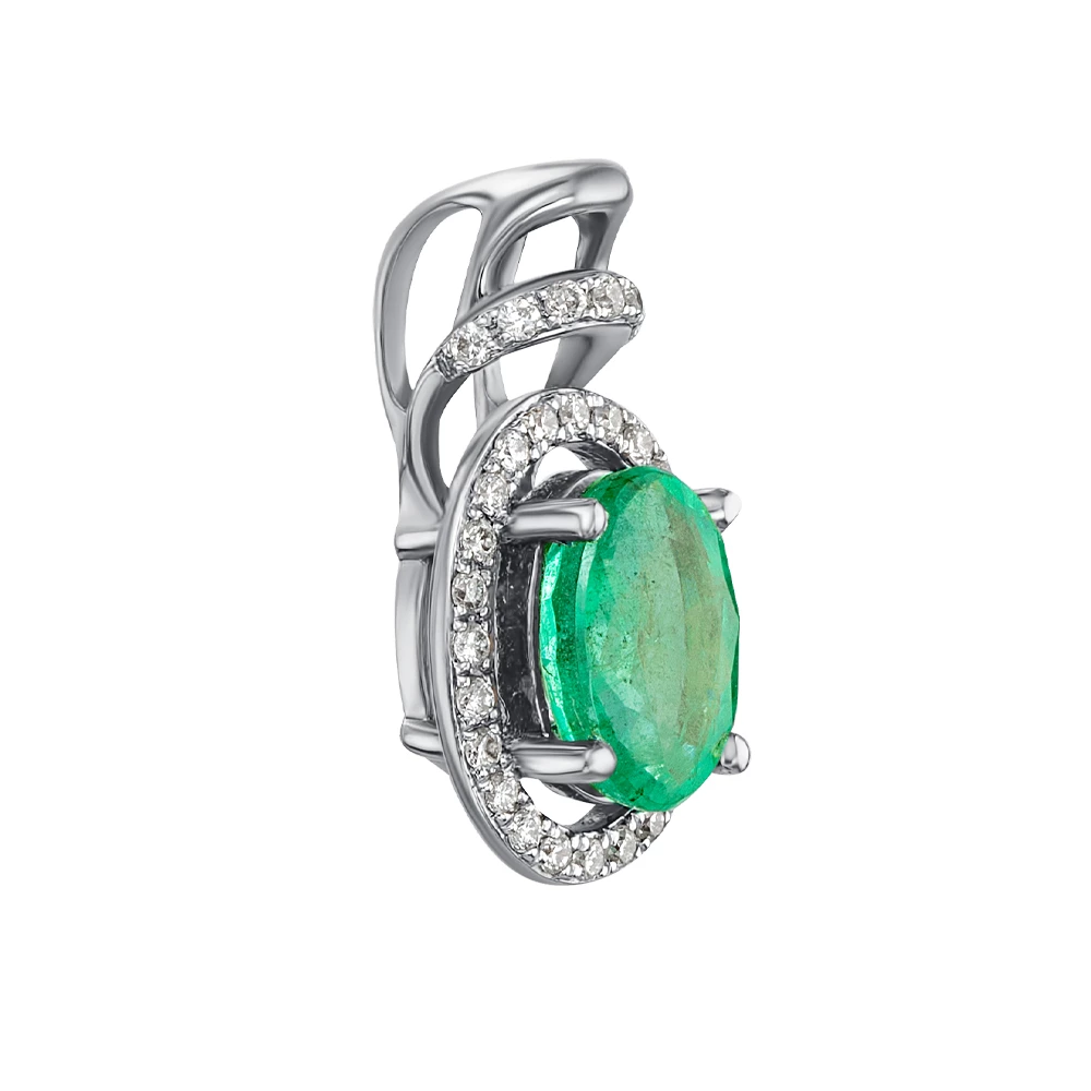 Подвес с изумрудом и бриллиантами в белом золоте 585 пробы. Украшение, которое Вы не встретите у подруг, оно выполнено в невероятном дизайне, игра бриллиантов завораживает блеском, а изумруд завершает композицию.
