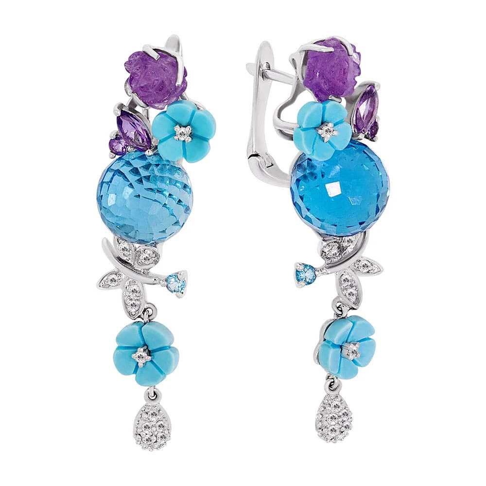 <p><strong>Размер:</strong></p> <p>длина - 39 мм</p> <p>ширина - 8 мм</p> <p>длина крючка к застежке - 6 мм</p> <p>швенза - 8 мм</p> <p>размер вставки - 39 х 8 мм</p> <h2><strong>Золотые серьги с бриллиантами и топазами</strong></h2> <p>Удивительные серьги изготовлены из белого золота 585 пробы, они завораживают взгляд своей цветочной композицией из драгоценных камней. Это изделие украшено топазами, бриллиантами, аметистами и бирюзой, они гармонично соединены между собой и создают невероятное сияние. Удобная английская застежка обеспечит Вам надежное крепление сережек, а покрытие из родия защитит украшение от износа. Этот изысканный аксессуар непременно придаст яркости Вашему праздничному образу, наделяя его роскошью и элегантностью.</p>