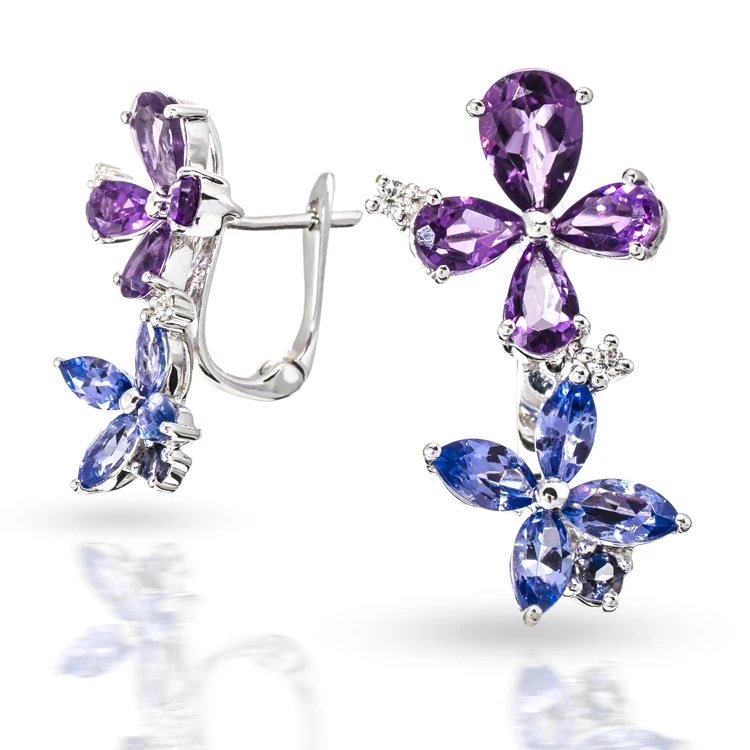<p><strong>Размер:</strong></p> <p>длина - 23 мм</p> <p>ширина - 10 мм</p> <p>длина крючка к застежке - 6 мм</p> <p>швенза - 9 мм</p> <p>размер вставки - 23 х 10 мм</p> <h2><strong>Золотые серьги с бриллиантами, аметистами и танзанитами</strong></h2> <p>Нежные серьги из белого золота 585 пробы, украшенные фиолетовыми аметистами, синими танзанитами и белыми бриллиантами. Камни надежно закреплены в крапановом касте и расположены в форме двух изящных цветочков. Гармоничное сочетание цветов создает композицию, завораживающую взор своим блеском и красотой. Изделие оснащено удобной английской застежкой, а также покрыто родием, защищающим его от износа. Эти серьги идеально подходят как для торжественных событий, так и для ежедневной носки, придавая Вашему образу легкости и женственности.</p>