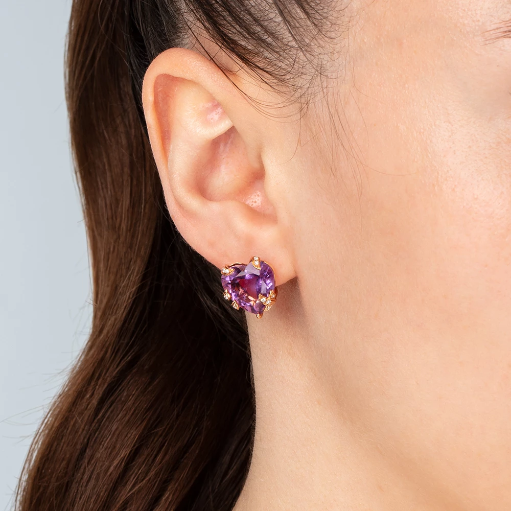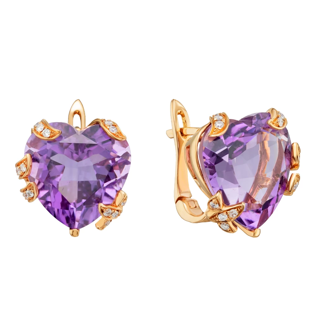 <p><strong>Размер:</strong></p> <p>длина – 20 мм</p> <p>ширина – 15 мм</p> <p>длина крючка к застежке – 5 мм</p> <h2><strong>Золотые серьги с бриллиантами и аметистом</strong></h2> <p>Эти удивительные серьги выполнены из красного золота 585 пробы. Центральным элементом украшения является изысканный фиолетовый аметист, символизирующий гармонию и духовный рост. Камень имеет огранку в форме сердца, придающую изделию особого романтического шарма. Серьги также инкрустированы белыми бриллиантами, наделяющими еще большим акцентом и блеском. Английская застежка комфортно фиксирует серьги на мочке, обеспечивая надежность и удобство в ношении. Нежный и роскошный дизайн делает их идеальным выбором как для праздничного, так и для повседневного дополнения элегантного образа.</p>
