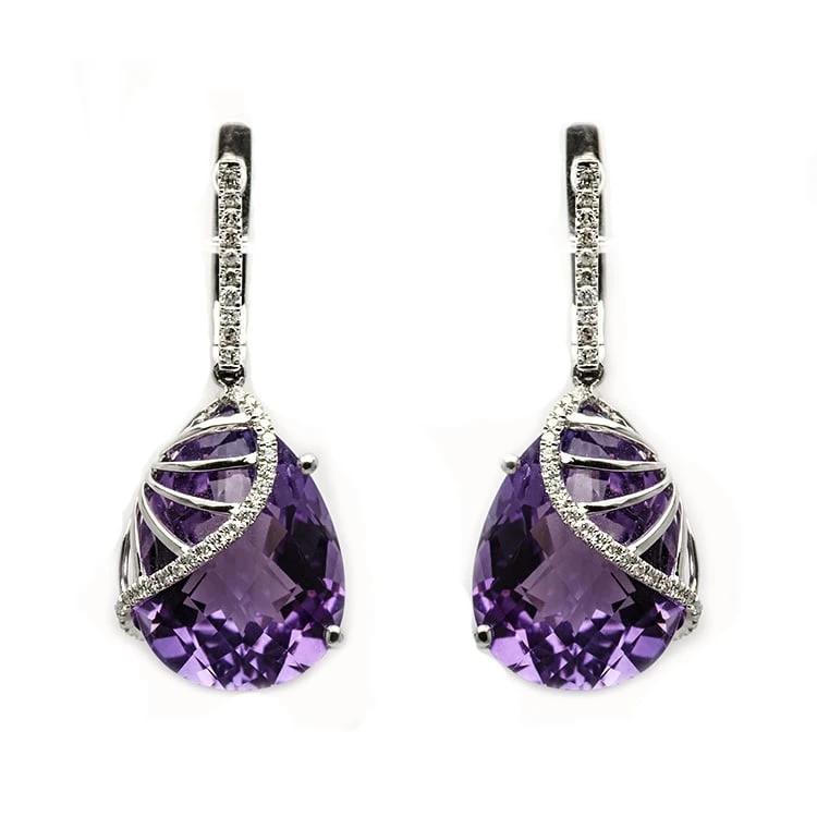 Серьги из белого золота с аметистом и бриллиантами. Украшение с аметистом подойдет для женщин разных возрастов.